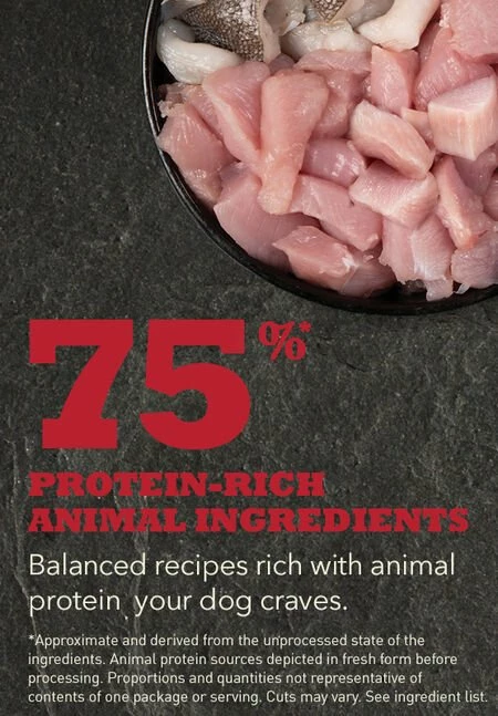 Ces aliments pour chiens contiennent 75 % de viande, dont du poulet et des œufs élevés en plein air, ainsi que du flet du Pacifique provenant de l’île de Vancouver. Toutes ces protéines sont placées à l’état frais pour être préparées, ce qui garantit que leurs nutriments et leurs saveurs restent intacts.