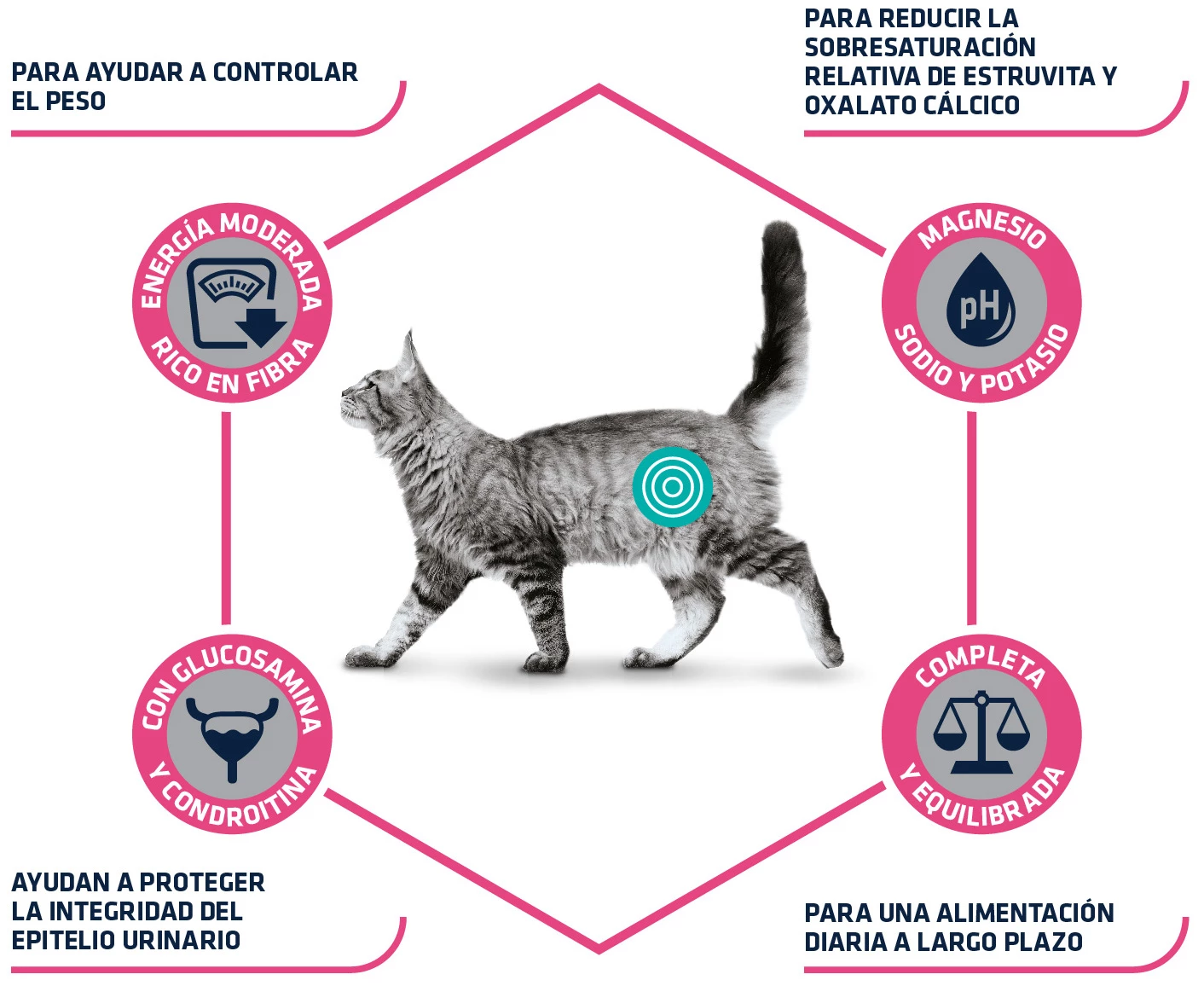 MODERATE ENERGY AND HIGH IN FIBER Énergie modérée et forte teneur en fibres pour aider à contrôler le poids. LOWER MAGNESIUM AND URINE PH Faible en magnésium et en pH urinaire, et plus élevé en sodium et en potassium pour réduire la sursaturation relative (RSS) de struvite et d’oxalate. WITH GLUCOSAMINE AND CHONDROITIN Avec la glucosamine et la chondroïtine : aide à protéger l’intégrité de l’épithélium urinaire. COMPLETE AND BALANCED Régime complet et équilibré pour une alimentation quotidienne à long terme. Poulet, protéines de maïs, protéines de volaille déshydratées, farine de maïs, fibres végétales, maïs, blé, protéines de porc déshydratées, protéines animales hydrolysées, graisse animale, protéines de blé, sel, chlorure de potassium, huile de poisson, citrate de potassium, sulfate de glucosamine-chondroïtine Substances acidifiantes de l’urine : protéines de maïs, chlorure d’ammonium, méthionine.