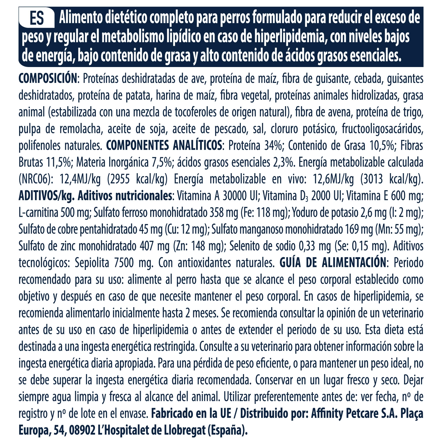 pour les chiens formul?s pour r?duire l’exc?s de poids et pour la r?gulation du m?tabolisme des lipides si l’hyperlipid?mie, le faible niveau d’?nergie, faible en gras et le niveau ?lev? d’acides gras essentiels des aliments di?t?tiques. d?fense active avec les immunoglobulines et les polyph?nols naturels scientifiquement prouv?s. prot?ines d’oiseaux d?shydrat? pois d’orge fibre de pois de ma?s de prot?ines de volaille d?shydrat?es prot?ine de pomme de terre en fibres v?g?tales de la farine de ma?s hydrolys?es prot?ines animales graisses animales stabilis? avec un m?lange de tocoph?rols de sel d’huile de l’huile de betterave bl? fibre de prot?ine d’origine naturelle d’avoine p?te de soja de poisson chlorure de potassium fructooligosaccharides polyph?nols naturels de polyph?nols naturels (0,01%)