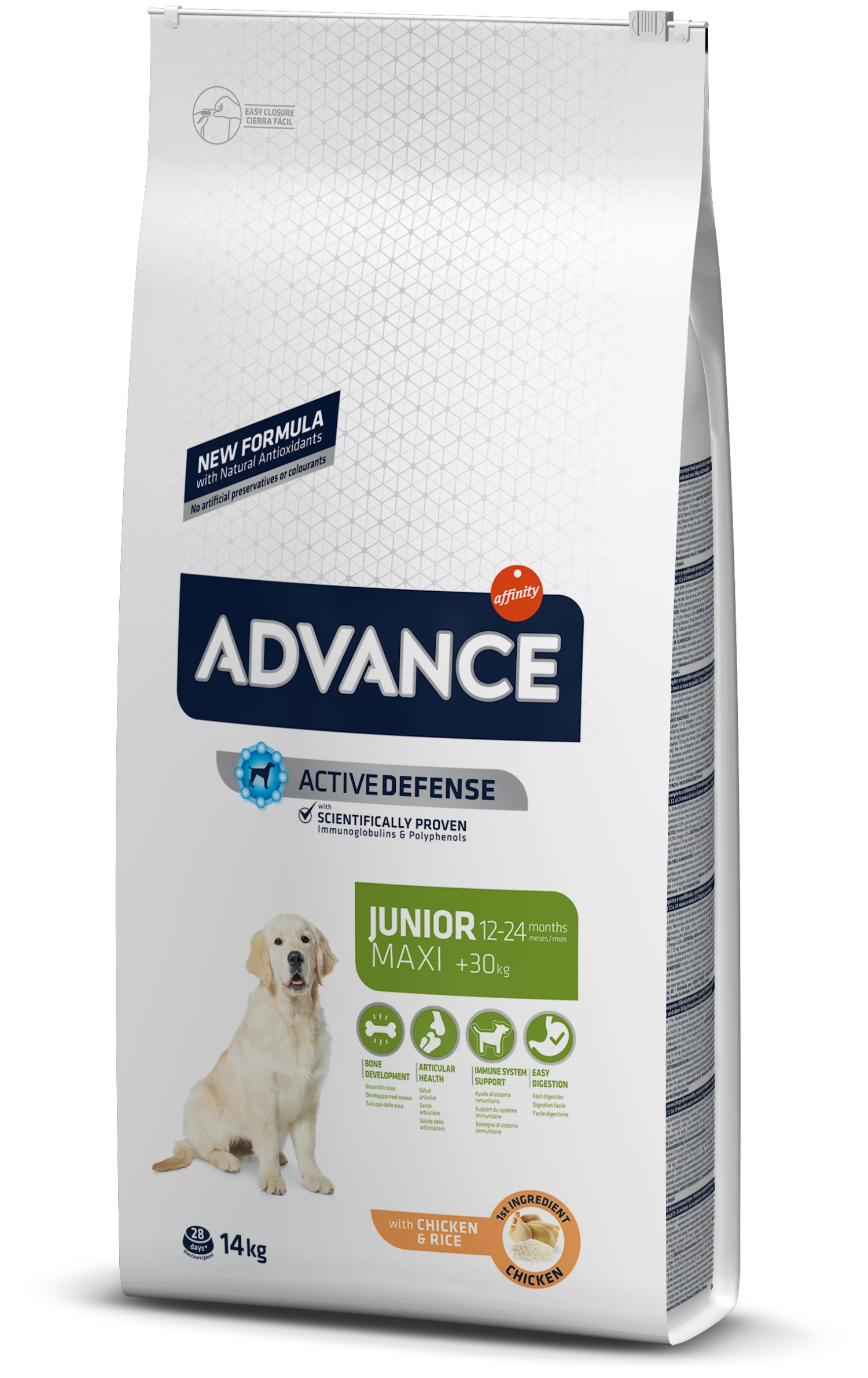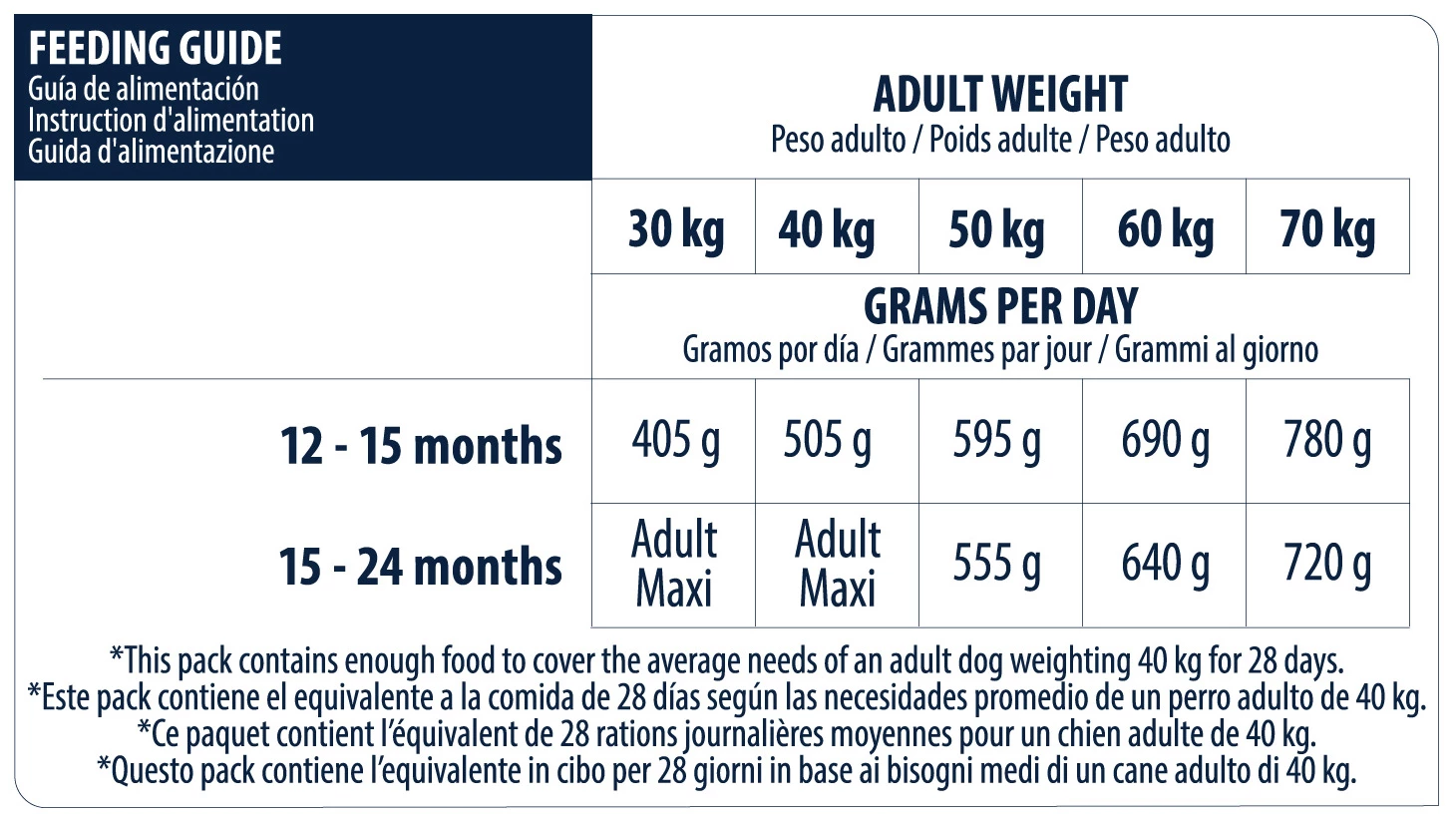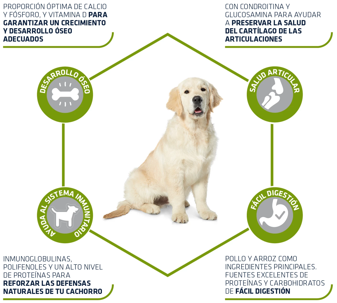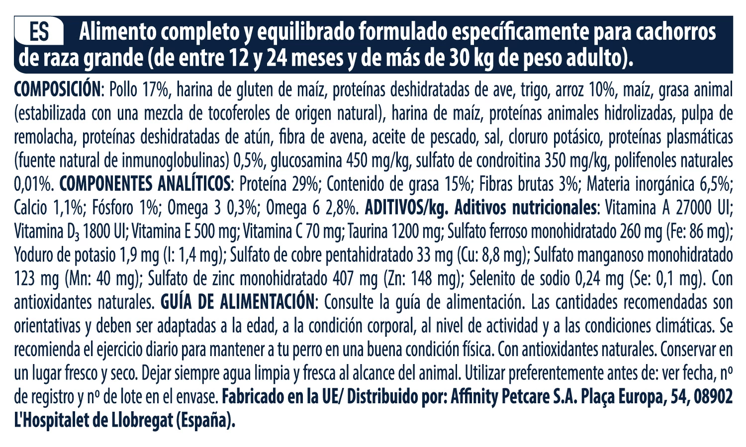 Aliment haut de gamme spécialement indiqué pour les chiens adultes (de 12 à 14 mois) de race grande (plus de 30Kg. de poids adulte) comprenant :