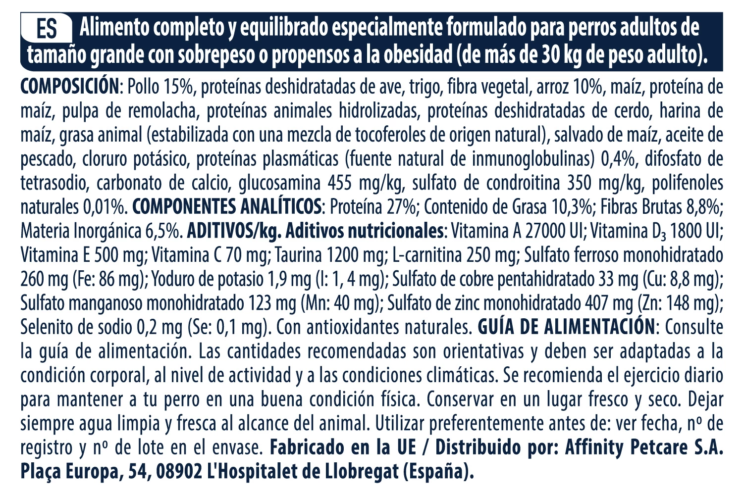 Aliment haut de gamme particulièrement adapté pour les chiens de grande race (poids adulte de plus de 30Kg) avec surpoids ou tendance à l’obésité, comprenant :