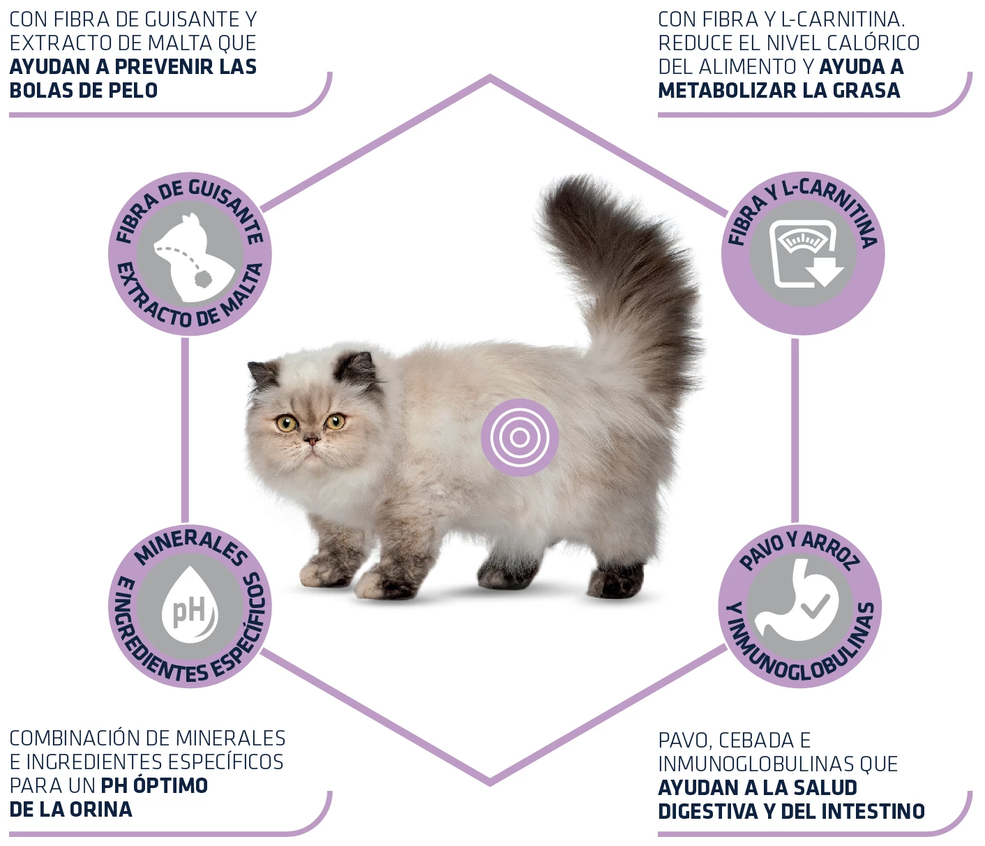Nourriture haut de gamme appropriée pour les chats ayant des problèmes de la formation de boules de poils et qui aide à prévenir l’obésité chez les chats castrés.