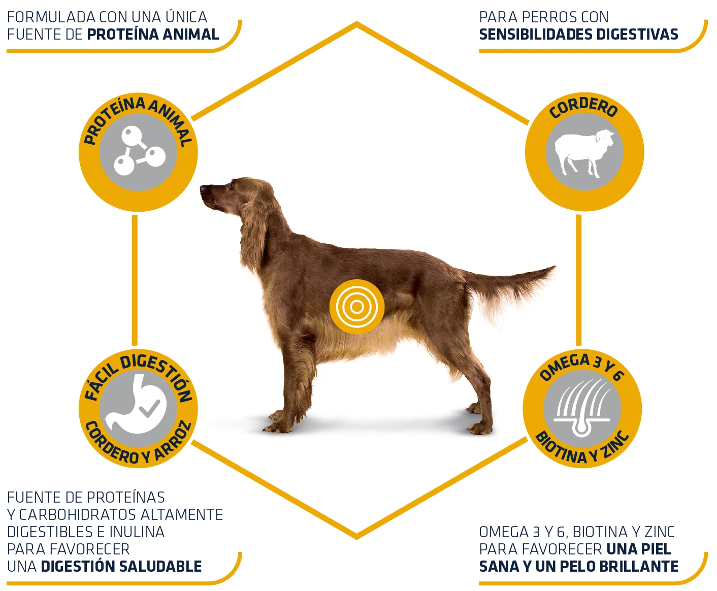 Aliment spécialement indiqué pour les chiens adultes de toutes races, souffrant de sensibilité digestive et/ou cutanée.