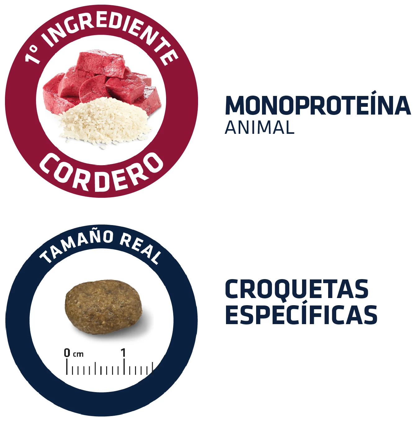 Composition:Agneau (15%), riz (15%), protéines déshydratées de volaille, maïs, farine de gluten de maïs, graisses animales, farine de maïs, protéines animales hydrolysées, protéines déshydratées de porc, pulpe de betterave, levure, huile de poisson, chlorure de potassium, carbonate de calcium, phosphate monocalcique, protéines plasmatiques, disphosphate tétrasodique, phosphate tricalcique, sel, extraits d’agrumes riches en bioflavonoïdes.Constituants analytiques:Protéine 28,0%; Teneur en matières grasses 18,0%; Fibres alimentaires brutes 2,0%; Matières minérales 6,5%; Calcium 1,2%; Phosphore 0,9%; Humidité 9,0%.Additifs/Kg. Additifs nutritionnels:Vitamine A 27000 UI; Vitamine D3 1800 UI; Vitamine E 670 mg; Vitamine C (sels de sodium et de calcium de monophosphate d’ascorbyle) 500 mg; Biotine 0,24 mg; Taurine 1200 mg; Sulfate FERREUX monohydraté 260 mg (Fe: 85 mg); IODURE de potassium 1,9 mg (I: 1,4 mg); Sulfate de CUIVRE pentahydraté 34 mg (Cu: 8,8 mg); Sulfate de MANGANÈSE monohydraté 124 mg (Mn: 40 mg); Sulfate de ZINC monohydraté 470 mg (Zn: 171 mg); SÉLÉNITE de sodium 0,24 mg (Se: 0,11 mg). Avec antioxygènes.