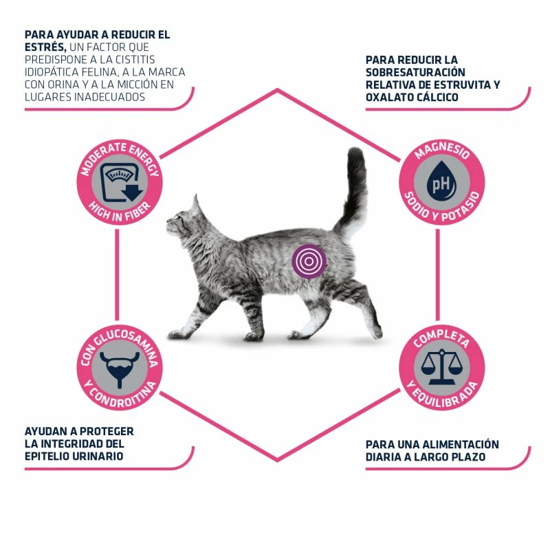 ADVANCE VETERINARY DIETS URINARY STRESS est un aliment diététique complet pour chats adultes contenant de la mélisse, du tryptophane et des peptides de poisson, des ingrédients qui aident à réduire le stress. Formulé avec un taux modéré de magnésium et des propriétés acidifiantes de l’urine, il est indiqué pour réduire la récurrence des calculs de struvite dans l’urine de votre chat.
