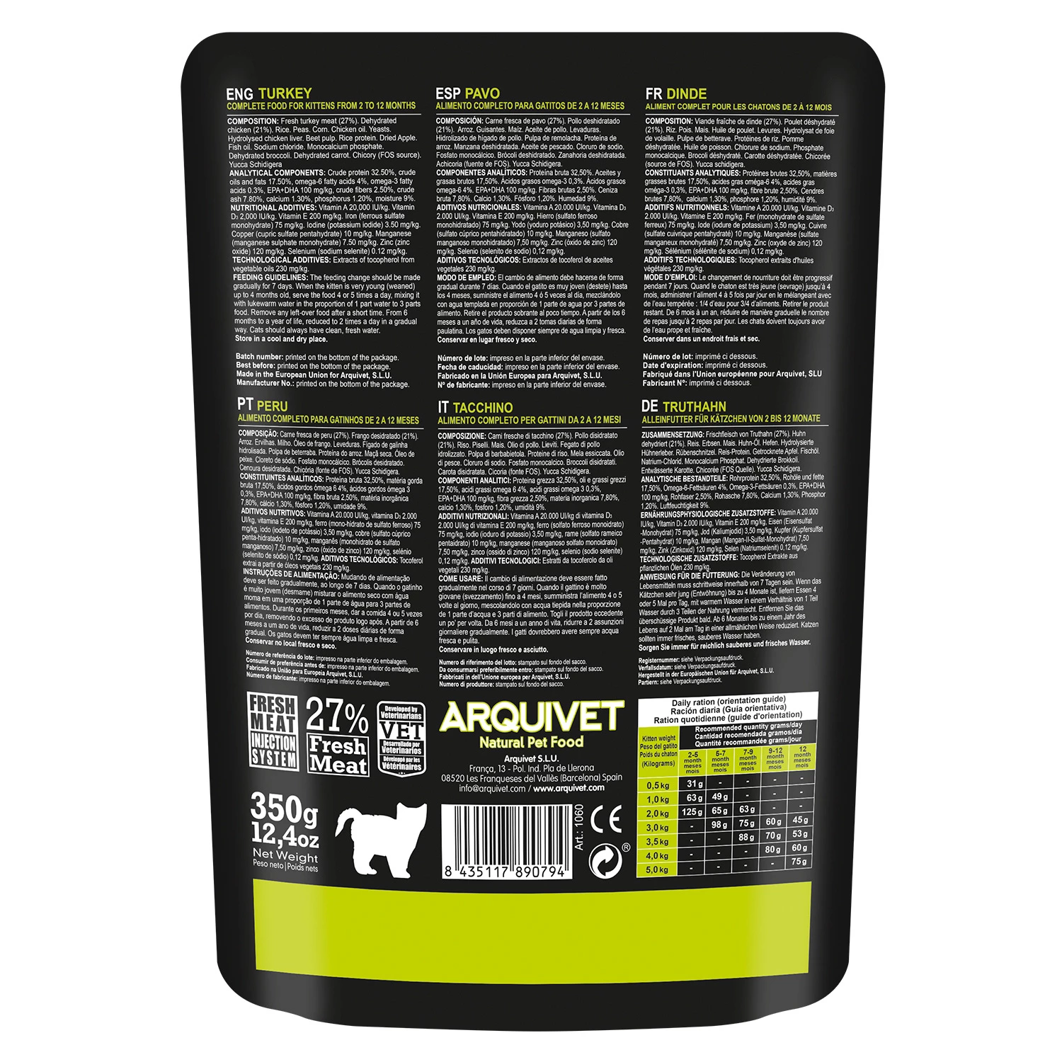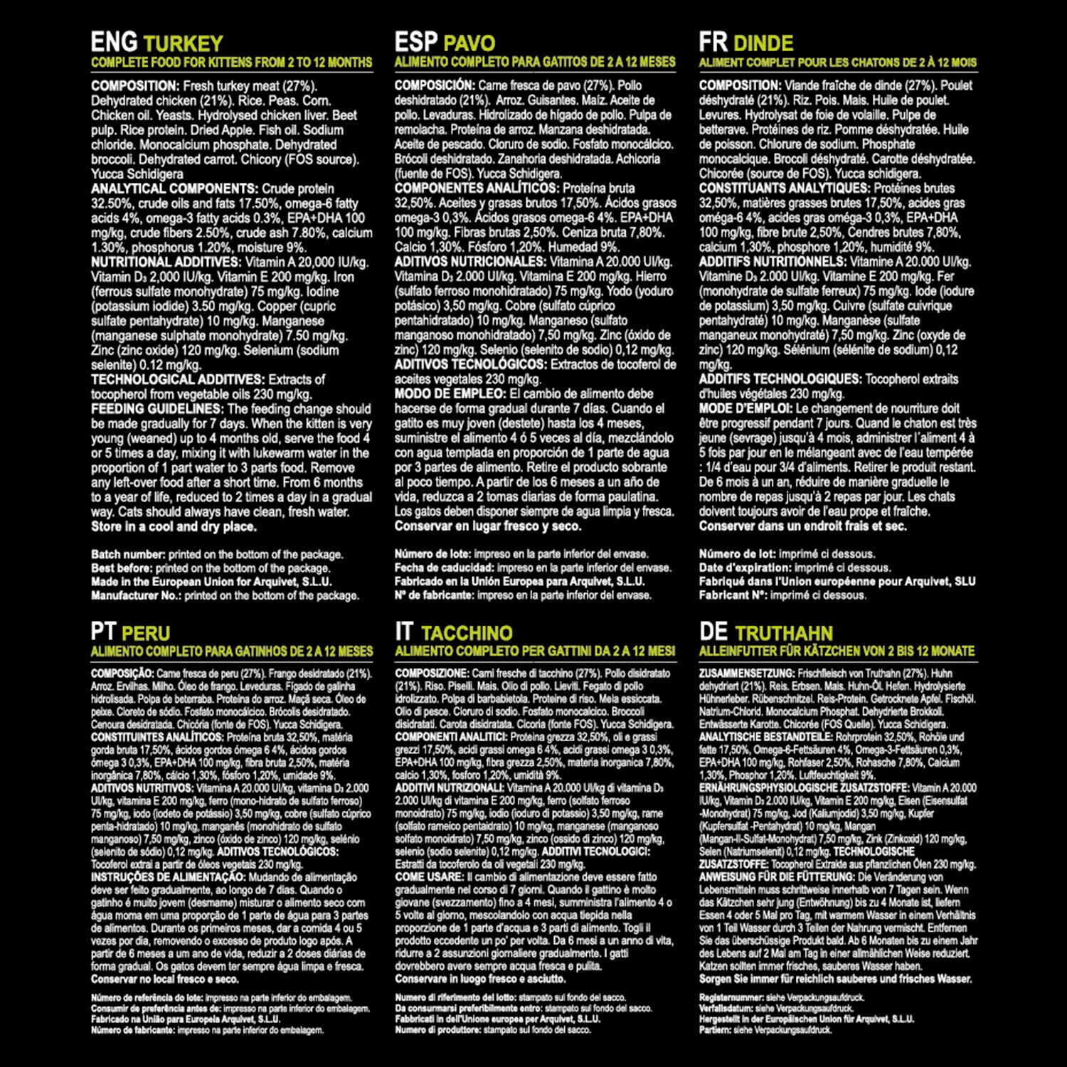 Aliment complet et équilibré à base de viande fraîche de dinde pour les chatons de 2 à 12 mois. Très riche en protéines de dinde, pauvre en graisses et avec un apport énergétique élevé pour favoriser le bon développement des muscles de votre chaton. Nous assurons la meilleure croissance. Aliment sans transgéniques. Sans OGM. Emballage Doypack de 350g.