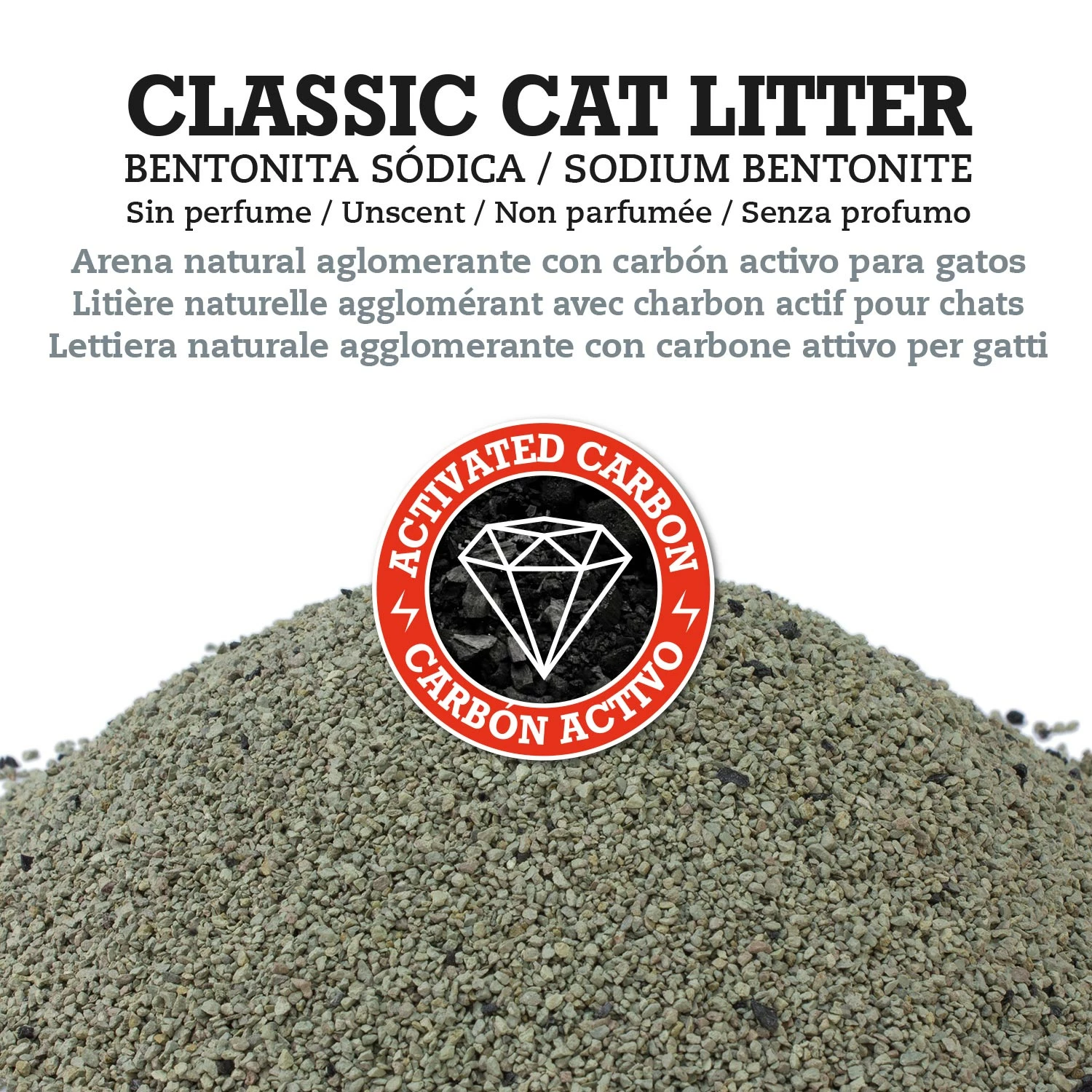Litière naturelle agglomérante pour chats, enrichie de charbon actif. Grande capacité d’agglomération, presque pas de poussière, faible adhérence aux pattes du chat (ce qui empêche la litière de se répandre sur le sol) et très bon contrôle des odeurs grâce au charbon actif. Les chats vous en remercieront.