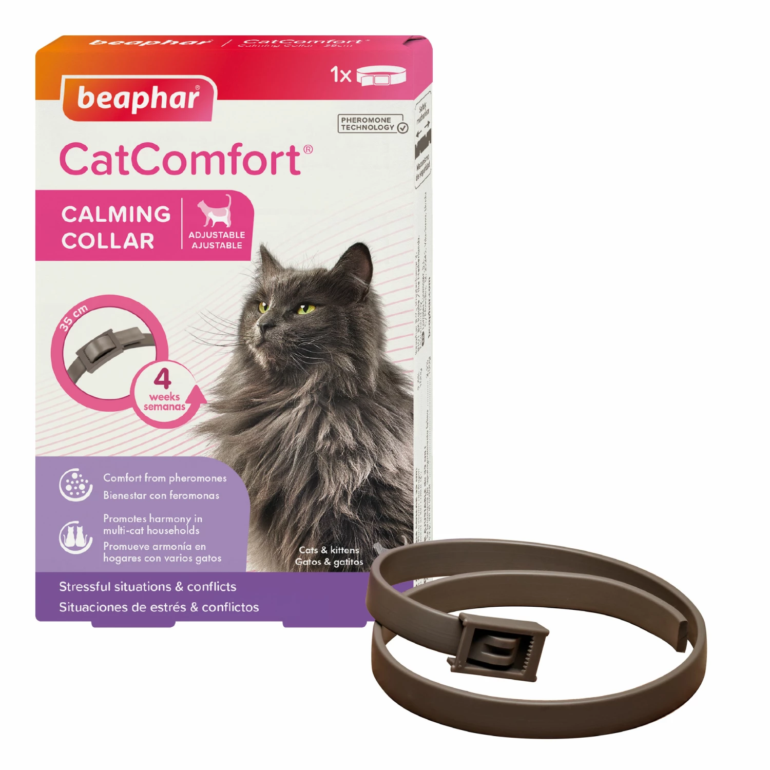 Le collier CatComfort® est idéal pour les situations stressantes et les chats ayant des problèmes de comportement. Il aide à améliorer la coexistence entre les chats et les nouveaux membres de la famille, car il aide à réduire les conflits et les tensions entre les chats. Il est très efficace contre les combats, les poursuites et autres signes de comportement agressif.Des études cliniques montrent que les phéromones utilisées dans Beaphar CatComfort® aident dans les situations stressantes et préviennent les comportements indésirables. L’utilisation de phéromones reconnues par les chats les calme et prévient les comportements indésirables tels que les grattages verticaux, les miaulements continus, le marquage urinaire et l’anxiété générale.Le collier Beaphar CatComfort® est particulièrement bénéfique lorsque les chats sont confrontés à de nouvelles expériences, telles que des périodes d’apprentissage, changements dans l’environnement, un nouveau membre dans la famille ou des maisons avec plus d’un chat.L’effet calmant peut également aider dans des situations stressantes telles que les voyages, les visites chez le vétérinaire, les tempêtes, les feux d’artifice et les bruits forts.La phéromone utilisée dans Beaphar CatComfort ® est immédiatement reconnu par les chats, puisqu’il est produit naturellement par la mère lorsqu’elle allaite ses chatons, transmettant des ‘messages de sécurité et de bien-être’ cruciaux au processus de formation d’un lien affectif. Comme les chats sont naturellement solitaires, Beaphar CatComfort® peut être particulièrement utile dans les foyers multi-chats car il aide à promouvoir une vie harmonieuse et convient aux chats de toutes races. Il n’affectera pas les autres animaux de la maison ni les chats sédatifs. peut être utilisé en conjonction avec tout médicament que votre chat peut prendre. Il est idéal pour aider à faciliter les liens entre chats ou avec les autres membres de la famille.Le collier est efficace en 15 minutes et pendant 4 semaines et a une longueur de 35cm. Mode d’emploi :Serrez le collier en laissant suffisamment d’espace pour insérer deux doigts entre le collier et le cou. Si le collier est adapté à un chat en pleine croissance, n’oubliez pas de desserrer et de vérifier le collier régulièrement. Il est important de s’assurer que le collier est en contact avec la peau et ne chevauche aucun autre collier. La chaleur corporelle du chat réchauffe le collier souple et déclenche la libération de phéromones. Le collier est efficace en 15 minutes et pendant 4 semaines et mesure 35 cm de long. Caractéristiques : RÉDUIT LE STRESS ET LES COMPORTEMENTS INDÉSIRABLES FAVORISE L’HARMONIE DANS LA MAISON LA TRANQUILLITÉ À L’INTÉRIEUR ET À L’EXTÉRIEUR DE LA MAISON AGIT EN 15 MINUTES, et dure 4 semaines. IDÉAL POUR FAVORISER LE LIEN entre les animaux ou les autres membres de la famille
