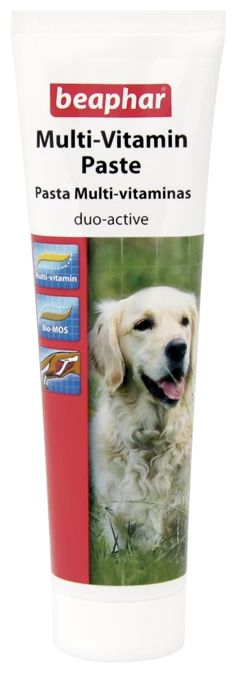 Beaphar Multi-Vitamin Coller pour les chiens est une pâte avec 2 fonctions en 1 tube. La combinaison de multi-vitamines et pâte Bio-MOS permet de soutenir une santé optimale et la digestion. La pâte multi-vitamines contient les vitamines et minéraux dont votre chien a besoin, ainsi que la L-Carnitine pour aider à la création de solides, des muscles sains, et pour permettre à l’organisme à brûler les graisses efficacement. Recommandé pour les chiens et les chiots de plus de 3 mois. La pâte Bio-MOS contient des minéraux supplémentaires et Bio-MOS qui stimule activement la flore intestinale saine de votre chien.