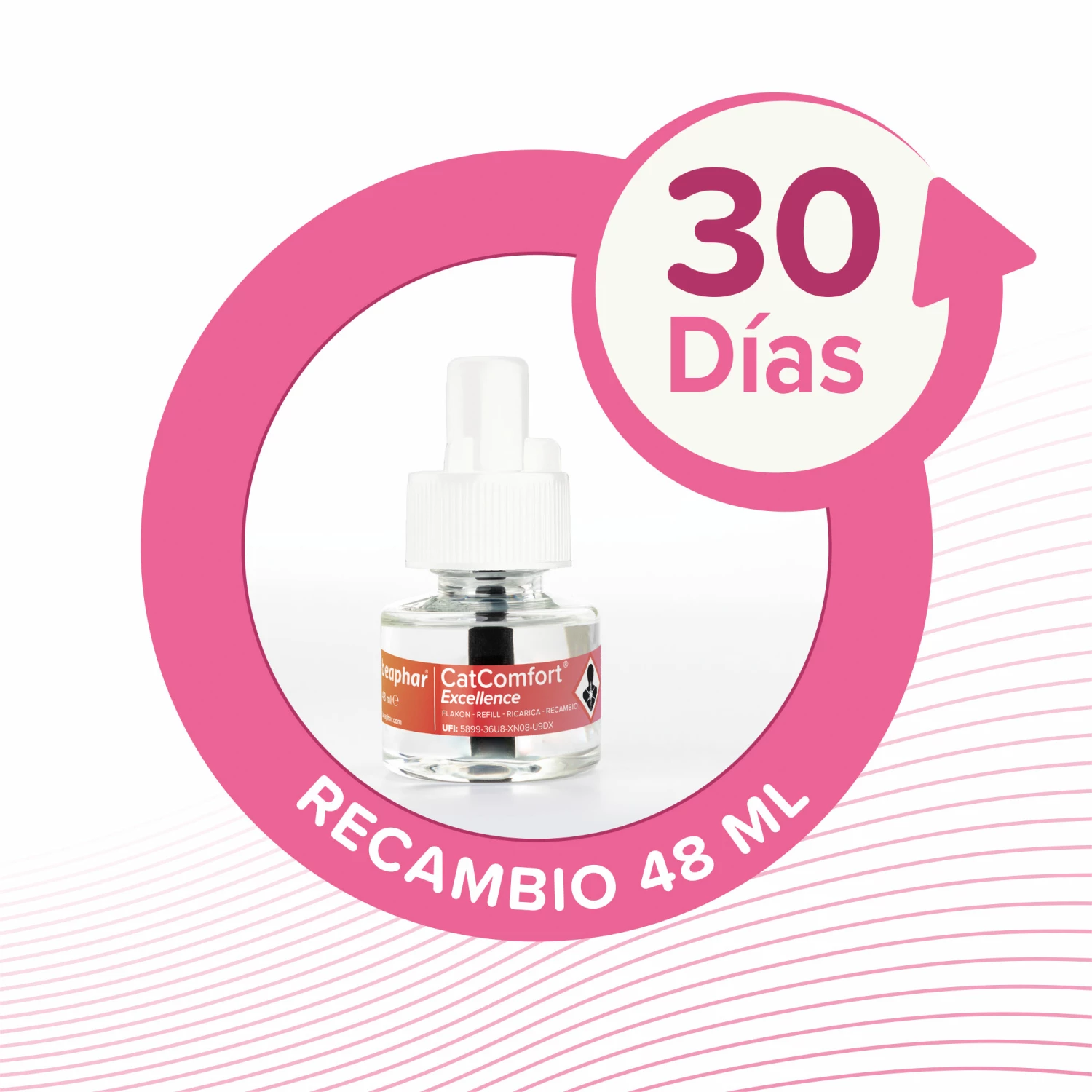 Le diffuseur CatComfort® Excellence est idéal dans les situations de stress et pour les chats ayant des problèmes de comportement, ou lorsqu’il y a des conflits entre chats. Il suffit de placer la recharge dans le diffuseur et de le brancher sur une prise électrique pour libérer les phéromones qui permettront à votre chat de se sentir à l’aise et détendu.