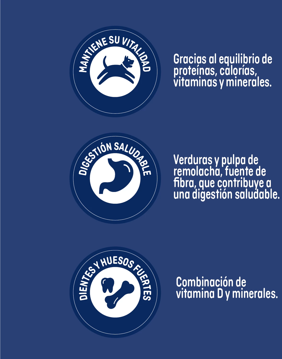 Ses croquettes apportent les protéines essentielles pour un maintien optimal des muscles. Le riz apporte les glucides nécessaires à une bonne digestion, et les céréales, les vitamines et les minéraux. Les nutriments dont votre chien a besoin pour conserver des os solides et des dents saines.