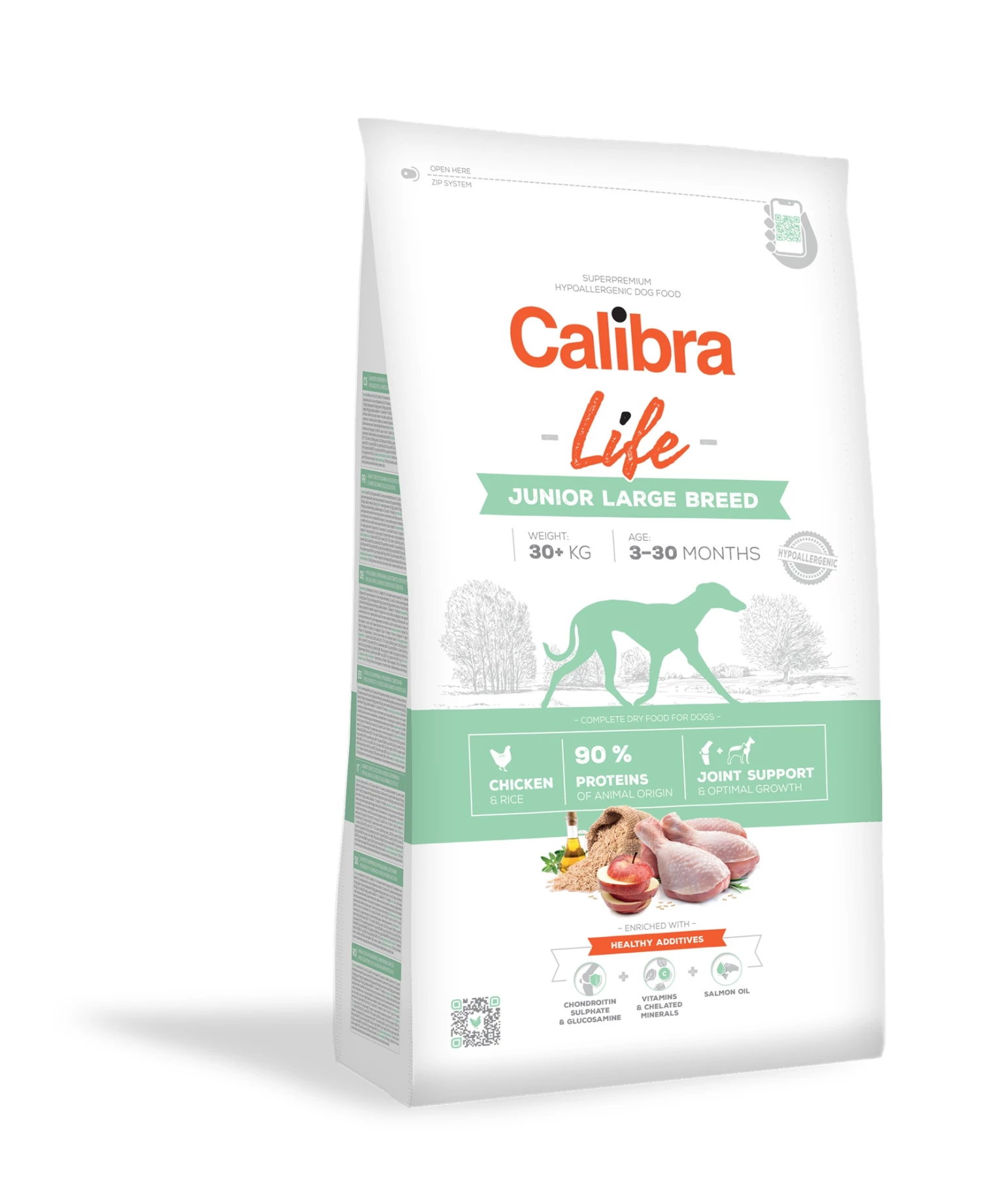 Calibra Dog Life Junior Large Breed Chicken – Nourriture super premium au poulet pour chiens juniors (3-30 mois) de grandes races (plus de 30 kg). Aliment sec où les protéines d’origine animale constituent 90% de la teneur totale en protéines. Il répond aux besoins d’une croissance optimale des grandes races et est également hypoallergénique. Caractéristiques : – Chondroprotecteur – Contient des prébiotiques – Source d’acides gras insaturés oméga-3 Instructions : Vous devez nourrir votre animal avec la dose quotidienne recommandée. Vous pouvez ajuster la dose en tenant compte de l’âge, de l’activité et de l’environnement du chien. Essayez d’atteindre la condition physique optimale de l’animal et évitez de le suralimenter. Il est recommandé de servir des aliments secs ou humides avec de l’eau ou du bouillon. Préparez toujours de l’eau potable fraîche avec de la nourriture.