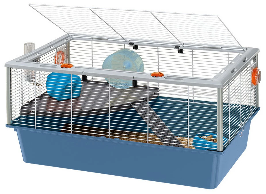 Le Criceti 15 est une grande cage avec une grande base rétentive en plastique pour empêcher la saleté de sortir de la cage.