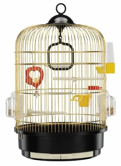 Regina est une petite cage ronde, élégante, pour canaris, oiseaux exotiques et autres petits oiseaux. Cette version laitonnée peut être posée sur ou accrochée à l’un de nos supports en plastique.
