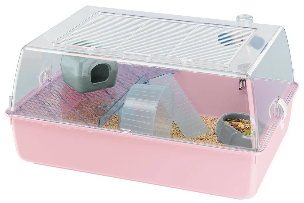 Mini Duna Hamster est une cage fabriquée en plastique robuste avec un toit transparent et une grille métallique sur le dessus assurant une bonne circulation de l’air pouvant être ouverte complètement pour le nettoyage.