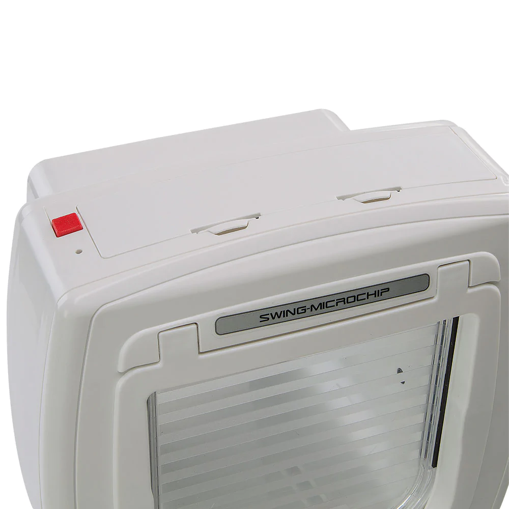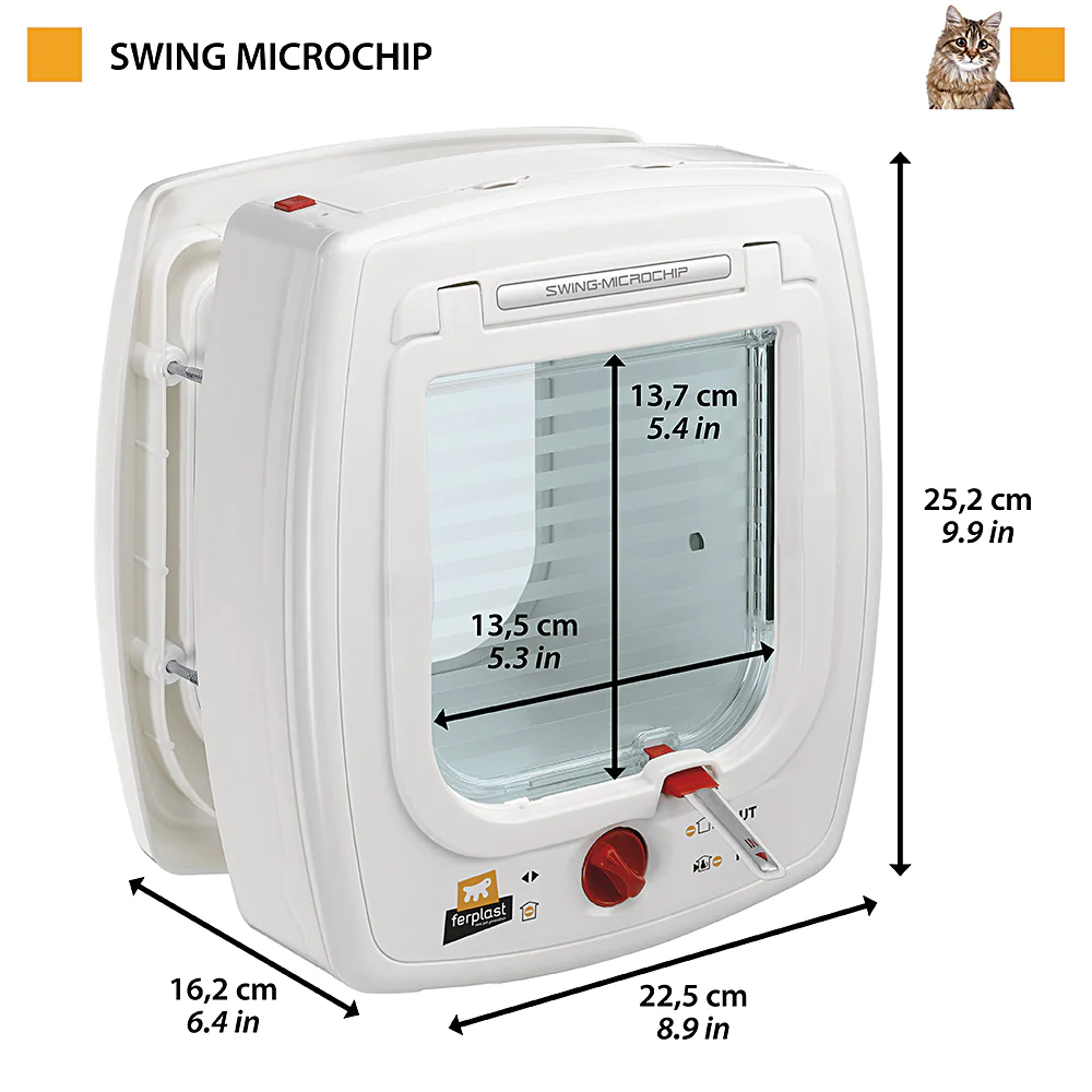 La nouvelle chatière Swing Microchip dispose d’une antenne spéciale qui lit et détecte la puce implantée dans vore chat, permettant à la porte de s’ouvrir dès que votre chat s’en approche. Elle peut enregistrer jusqu’à 32 micropuces standards ISO 11784 et a été spécialement conçue et testée pour fonctionner partout dans le monde. Enregistrer le code de la micropuce est très simple et rapide : approchez simplement votre chat et appuyez sur le bouton correspondant pour sauvegarder le code. Swing Microchip peut être installé sur une porte en bois ou en verre, ou un mur. Ce nouveau modèle partage avec la gamme Swing sont système coupe-vent et le système d’ouverture 4 styles. Vous pouvez décider de laisser la liberté à votre chat de : entrer et sortir, entrer seulement, sortir seulement, ou complètement fermer la porte. Cette chatière présente également un indicateur de passage qui permet de savoir si votre chat est dehors ou dedans. Swing Microchip fonctionne sur batterie et dispose d’un indicateur de charge faible. Ne vous inquitez pas si la batterie est complètement vide et que vous devez la remplacer complètement : les micropuces sont toujours enregistrées et vous n’aurez pas à répéter l’opération. Au cas où votre chat n’aurait pas de micropuce, vous pouvez utiliser le collier avec micropuce fourni gratuitement dans le pack. Avantages: – Système de lecture des micropuces implantées qui permet à la porte de s’ouvrir – Peut enregistrer jusqu’à 32 micropuces standards ISO, identiques partout dans le monde – S’adapte de façon universelle sur les portes en bois ou en verre, ou les murs – Complet avec indicateur de dernière direction et système de verrouillages 4 modes – Système stop-vent innovant – Fonctionne sous batterie – Indicateur de faible niveau de batterie inclus – Complet avec collier pour chat et micropuce Dimensions : 22,5 x 16,2 x h 25,2 cm