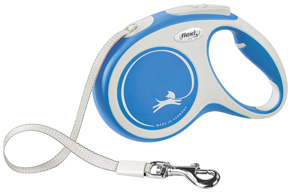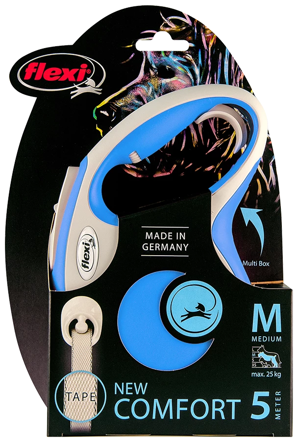 LINGE FLEXI NEW COMFORT AVEC TAPE BLEUE La laisse bicolore au design parfait attire notre attention. New Comfort vous offre toutes les caractéristiques que vous souhaitez pour une promenade que vous adorerez. Plus de contrôle grâce à de meilleurs freins. D’autres accessoires comme le système d’éclairage à LED ou la Multi Box pour ranger les friandises ou les sacs d’hygiène. Amusez-vous bien !