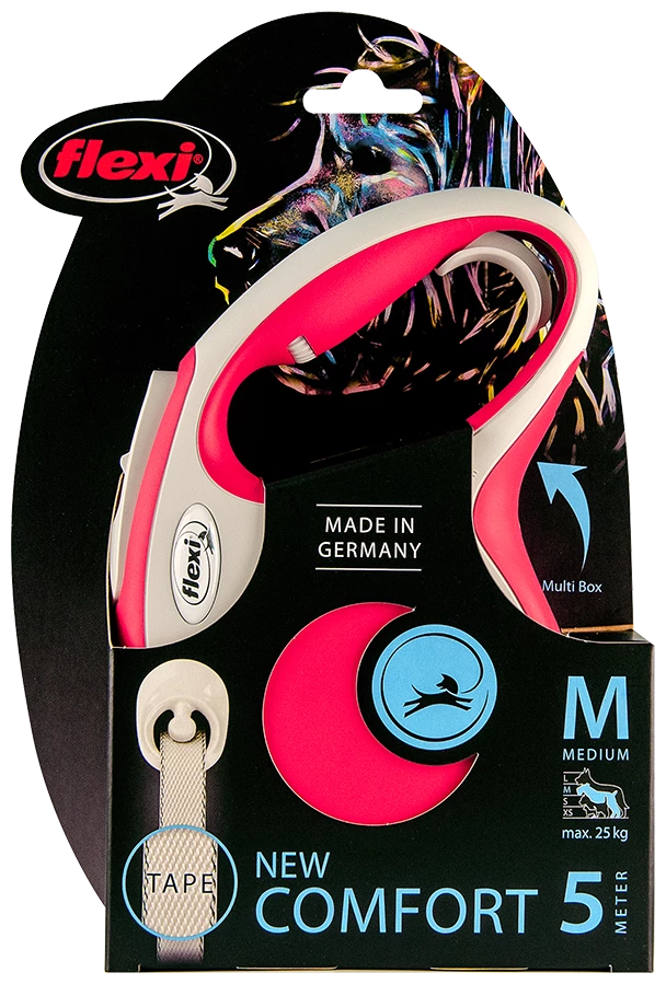 LAISSE FLEXI NEW COMFORT TAPE ROUGE La laisse bicolore au design parfait attire notre attention. New Comfort vous offre toutes les caractéristiques que vous souhaitez pour une promenade que vous adorerez. Plus de contrôle grâce à de meilleurs freins. D’autres accessoires comme le système d’éclairage à LED ou la Multi Box pour ranger les friandises ou les sacs d’hygiène. Amusez-vous bien !