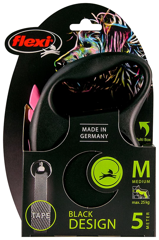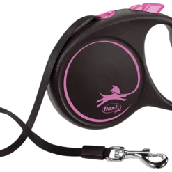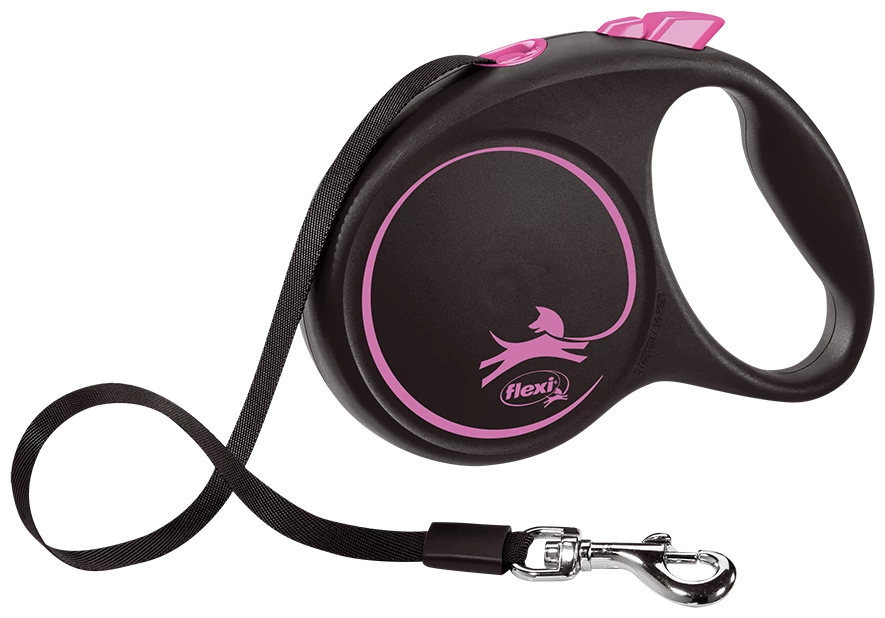 FLEXI BLACK DESIGN CINT PINK Le Flexi Black Design se décline en trois couleurs vives qui forment un contraste saisissant avec le boîtier noir, ainsi qu’une laisse noire subtile avec un logo classique.