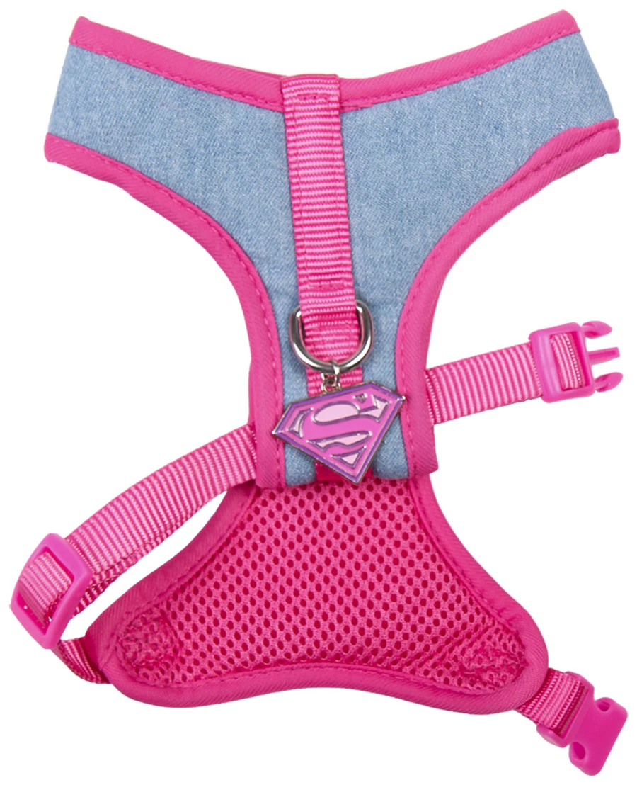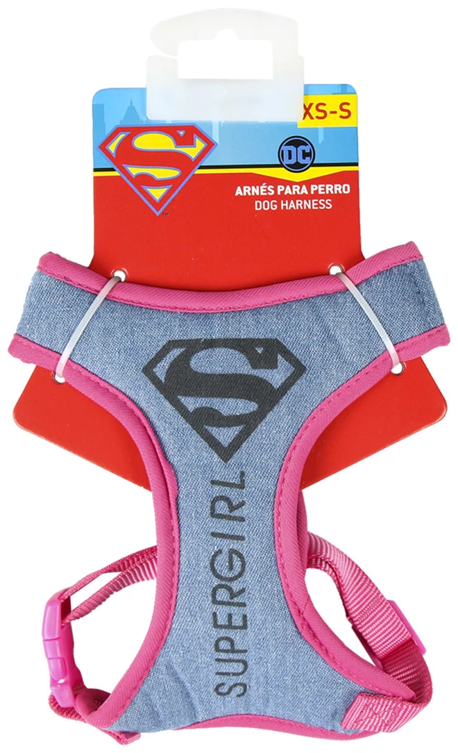 Harnais pour chien SuperGirl © en tissu denim avec intérieur en maille, rembourré (protège les poils), respirant, ajustable et léger, idéal pour la promenade et le dressage d’animaux, boucle résistante Produit officiel – DC Comics ©.