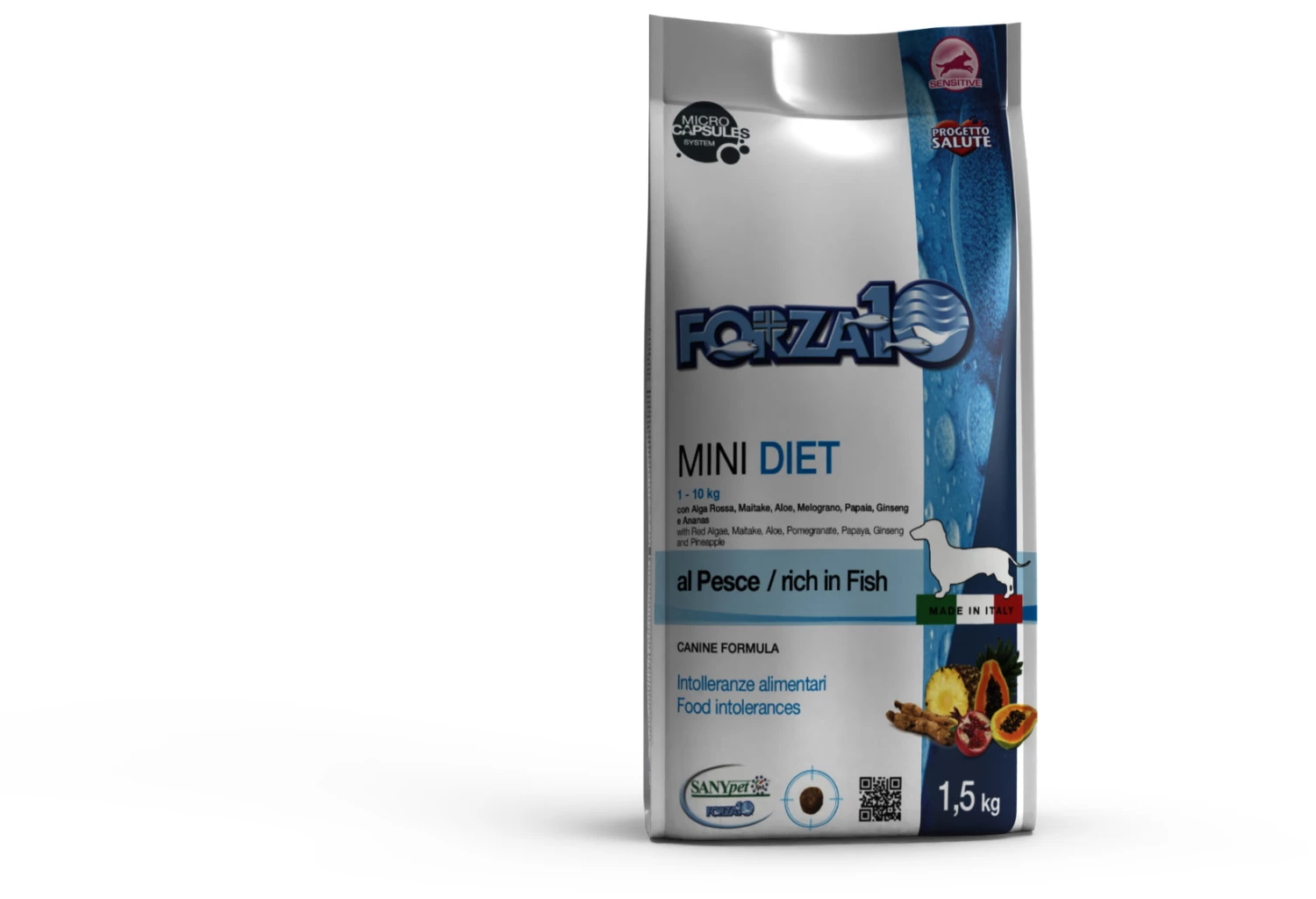 Mini Diet au Poisson est la référence de la ligne Diététique étudiée par SANYpet pour satisfaire les besoins de tous les chiens particulièrement sensibles à la viande provenant de l’élevage intensif. Bases cliniques: les études cliniques ont montré que la grande majorité des chiens et des chats qui sont alimentés avec du poisson de mer et/ou de la viande qui ne provient pas de l’élevage intensif ne présente aucune des troubles qui sont fréquemment liés à l’alimentation. Sur la base de ces études SANYpet a conçu les produits FORZA10, lignes complètes, diététique et de maintien, pour chats et chiens de toutes races et toutes tailles.