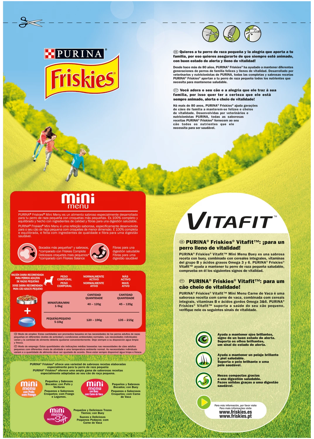 Nourriture Friskies avec du buf pour chiens adultes de petites races. Les croquettes Friskies Mini Menu sont plus petites et plus délicieuses, adaptées à ceux animaux de compagnie. Le complexe Vitafit remplit votre animal dénergie et de vitalité, avec des vitamines et des acides gras essentiels. Disponible en 2 formats.