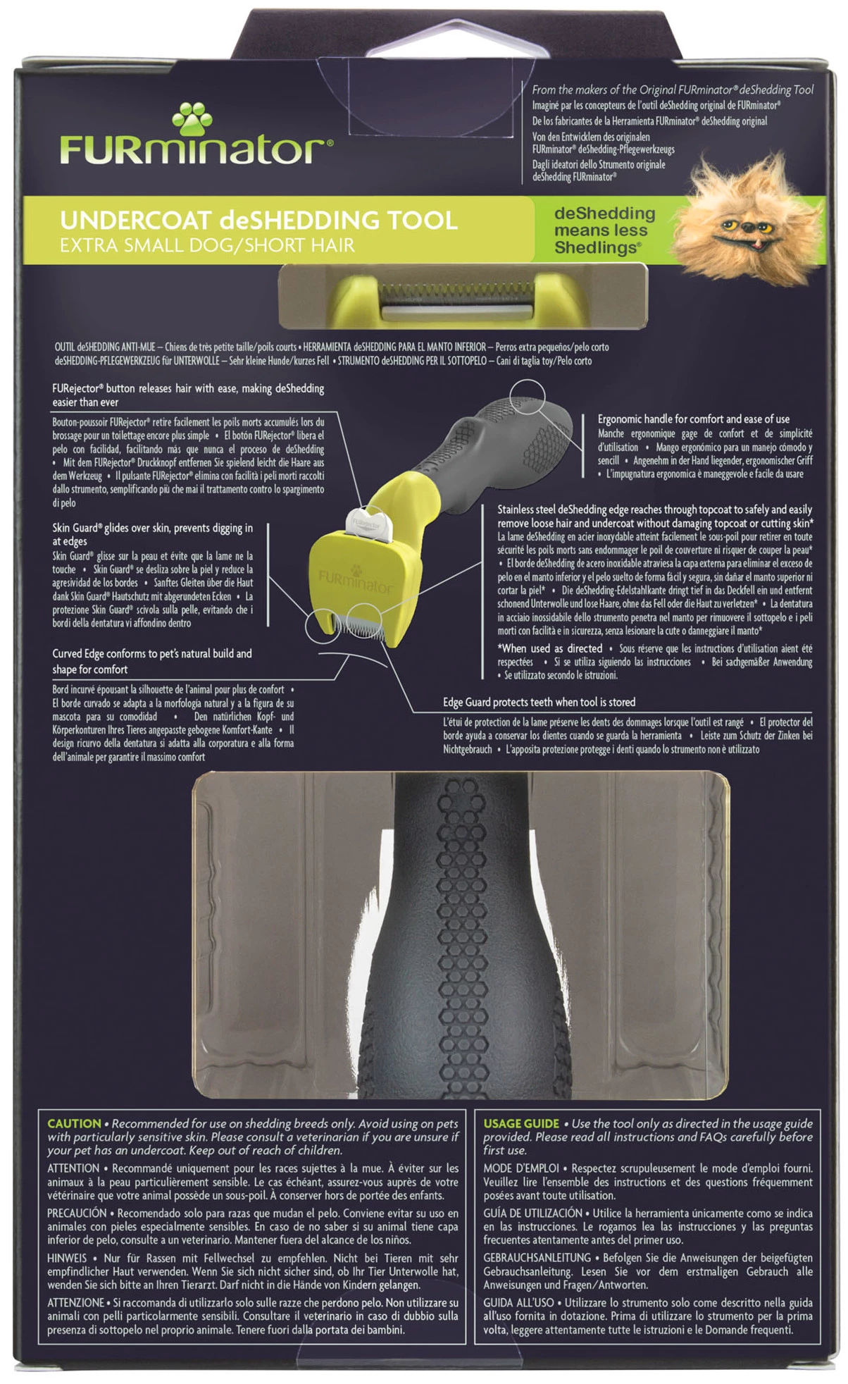 L’outil d’élimination du sous-poil FURminator® pour les chiens de très petite taille à poil court élimine 90 % des poils perdus lors de la mue. Utiliser 1 à 2 fois par semaine par sessions de 10 à 20 minutes sur un pelage sec.