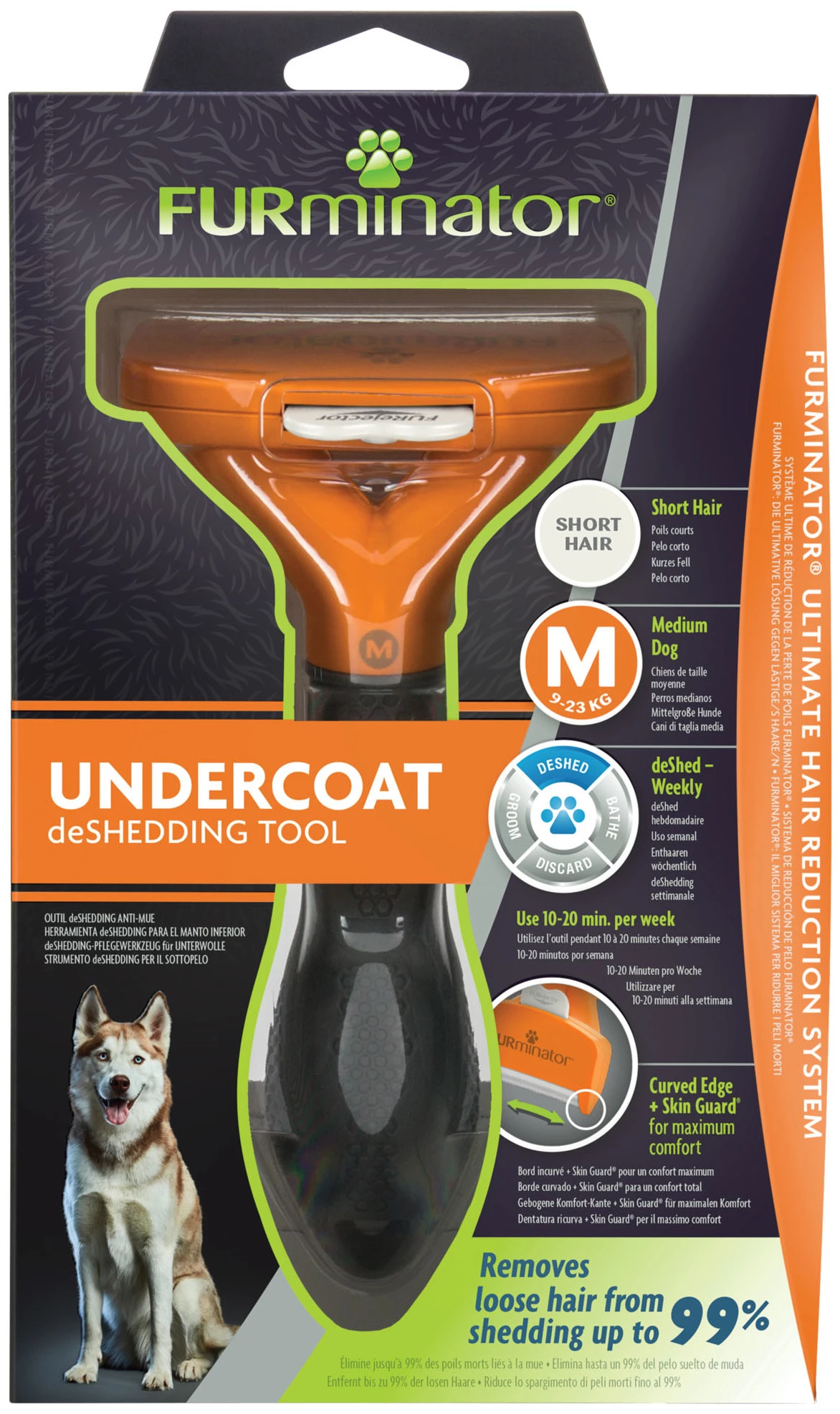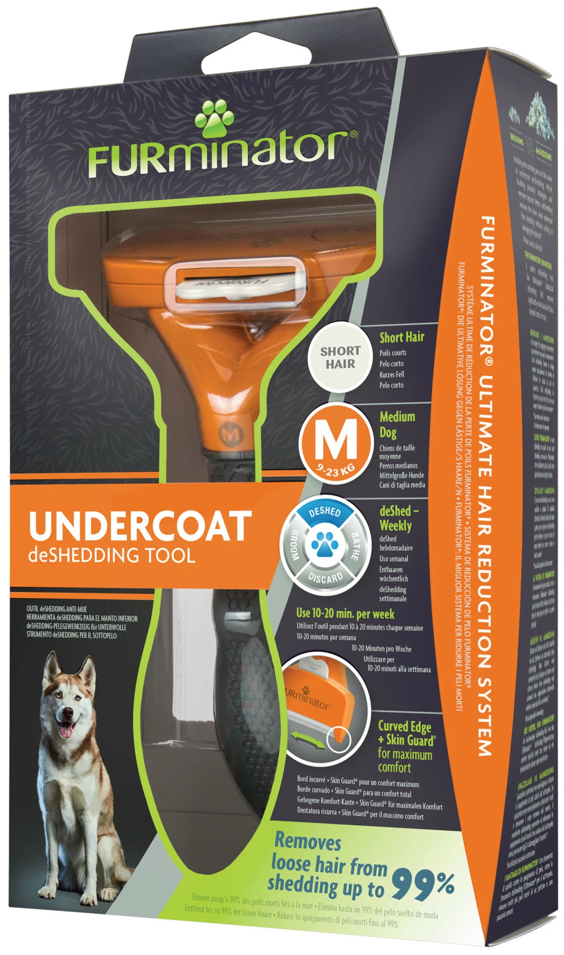 L’outil d’élimination du sous-poil FURminator® pour les chiens à poils courts de taille moyenne élimine 90 % des poils perdus lors de la mue. Utiliser 1 à 2 fois par semaine par sessions de 10 à 20 minutes sur un pelage sec.