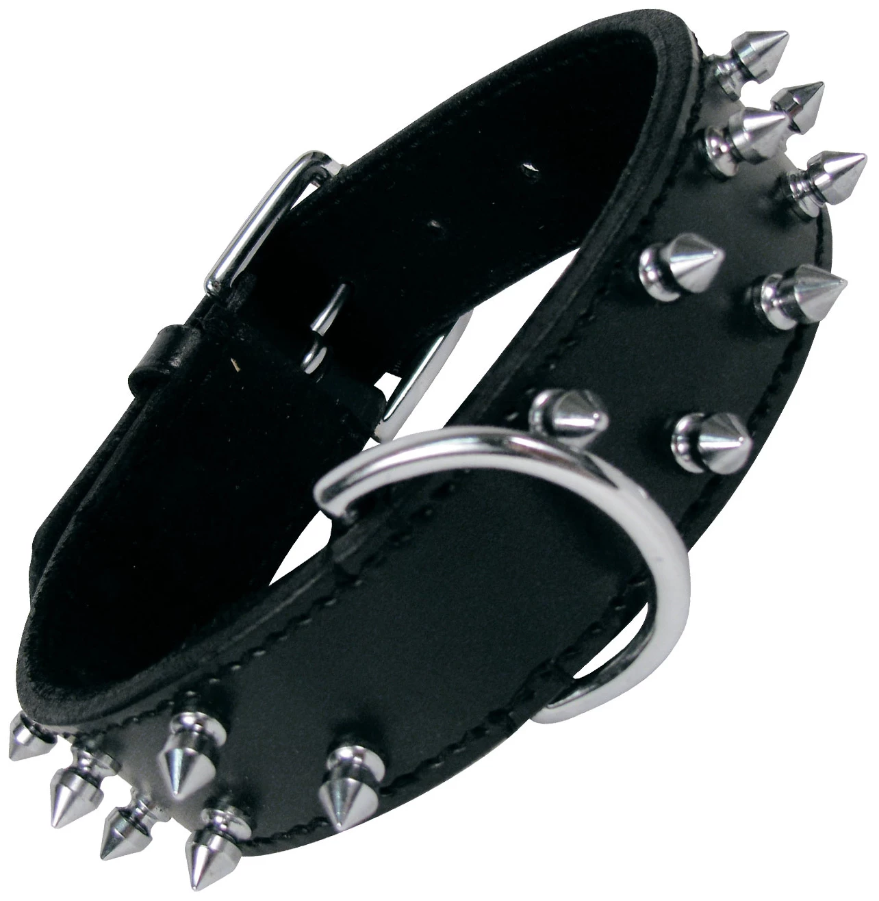 Le collier en cuir métallique avec des doubles brochettes pour les chiens est le collier que votre chien attendait.