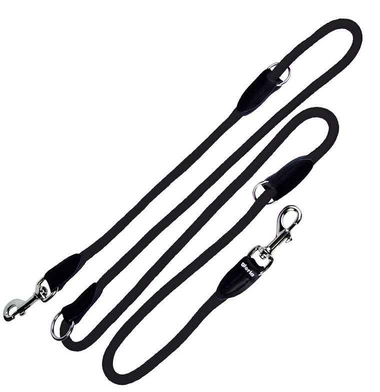 Laisse pour chien noire multi-positions avec trois anneaux chromés intérieurs qui permettent de varier la longueur de la laisse. Fabriqué en nylon, avec des coutures renforcées.