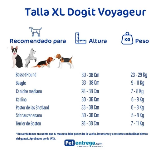 Le Dogit® Voyageur est disponible en 4 tailles différentes (petit, moyen, grand, très grand) et en couleurs assorties.