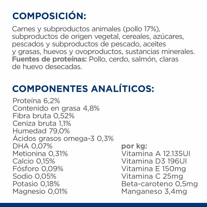 Nourriture humide complète pour chats adultes ayant des problèmes rénaux, cardiaques et/ou articulaires. Hill’s Feline k/d + Mobility est une recette faible en phosphore pour freiner la progression de la maladie rénale. Elle renforce les cartilages des articulations à travers des chondroprotecteurs. Au poulet. Sachets de 85 gr.