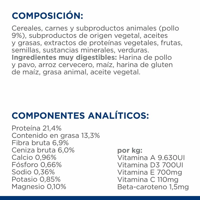 au poulet: blé, farine de poulet (9%) et dinde, riz à la bière, maïs, farine de gluten de maïs, noix de pécan, orge, avoine, digest, farine de son de pois, graisse animale, graines de lin, pulpe de betterave séchée, huile de soja, pulpe d’agrumes séchée, huile de poisson, pulpe de canneberge séchée, courge séchée, gingembre séché, vitamines, oligo-éléments et bêta-carotènes. Avec antioxydant naturel (mélange de tocophérols).