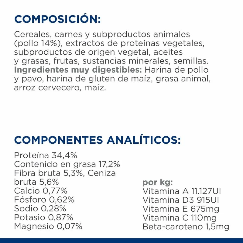 au poulet: poulet (14%) et farine de dinde, farine de gluten de maïs, graisse animale, riz de brasserie, maïs, noix de pécan, orge, avoine, cellulose, pulpe de betterave séchée, digest, minéraux, graines de lin , pulpe d’agrumes séchée, huile de poisson, myrtilles séchées, courge séchée, fructooligosaccharides (0,05%), vitamines, taurine, psyllium, oligo-éléments et bêta-carotènes. Avec antioxydant naturel (mélange de tocophérols).