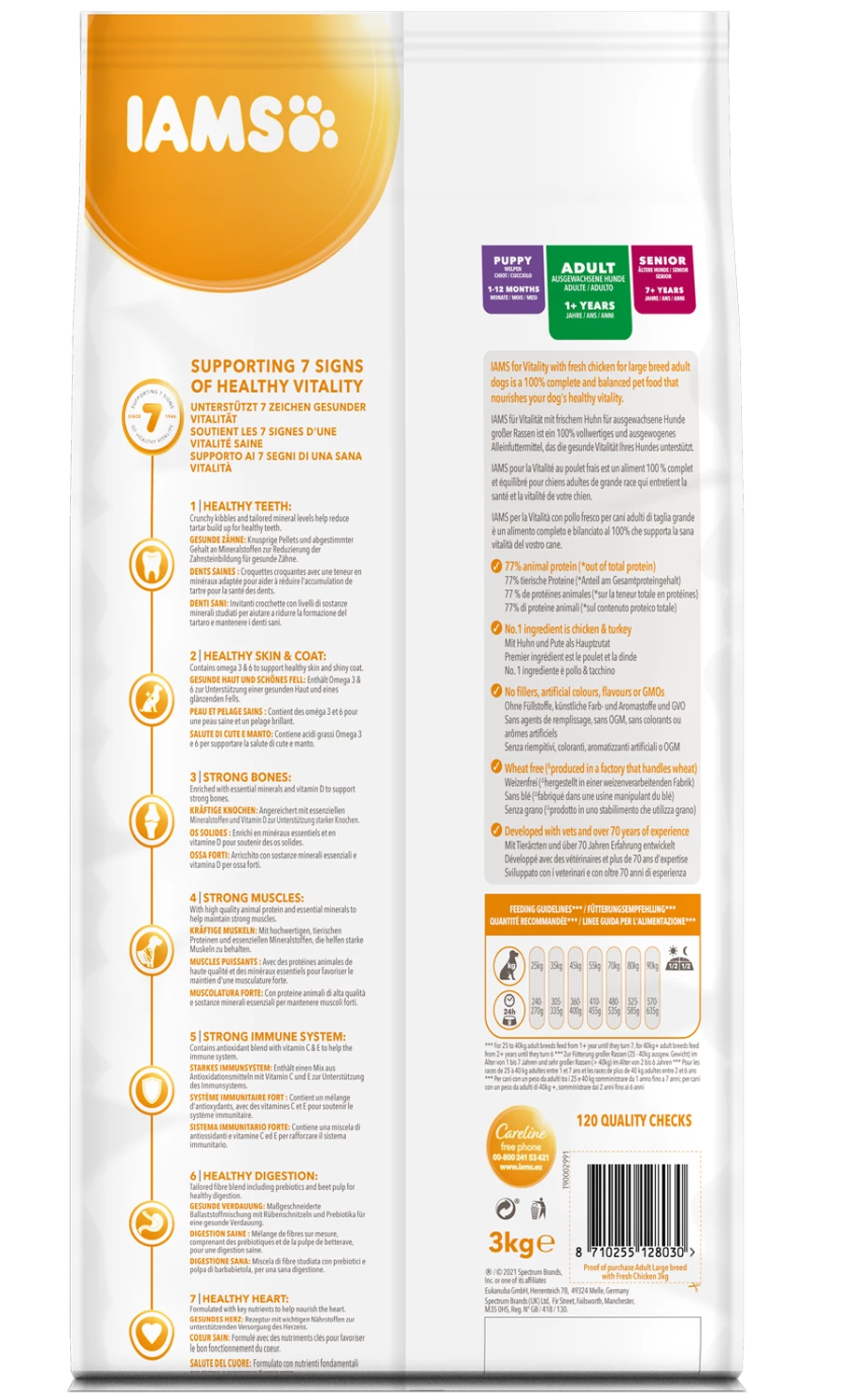 La gamme d’aliments IAMS proactive contient des protéines de haute qualité, ne contient pas de colorants artificiels et sont également enrichi avec des prébiotiques qui agissent dans l’appareil digestif en favorisant une bonne digestion et un système immunitaire fort. IAMS garantit une excellente santé pour votre chien avec vétérinaire a recommandé une alimentation complète et équilibrée.