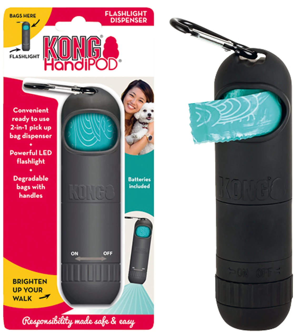 Distributeur de sacs avec lampe de poche: Le distributeur de sacs avec lampe de poche KONG HandiPOD est conçu pour les propriétaires d’animaux qui veulent promener leur chien en toute sécurité, de jour comme de nuit. La puissante lampe de poche à DEL illumine votre promenade, tôt le matin et pendant la nuit, vous protégeant ainsi que votre chien. Il contient 15 sacs.