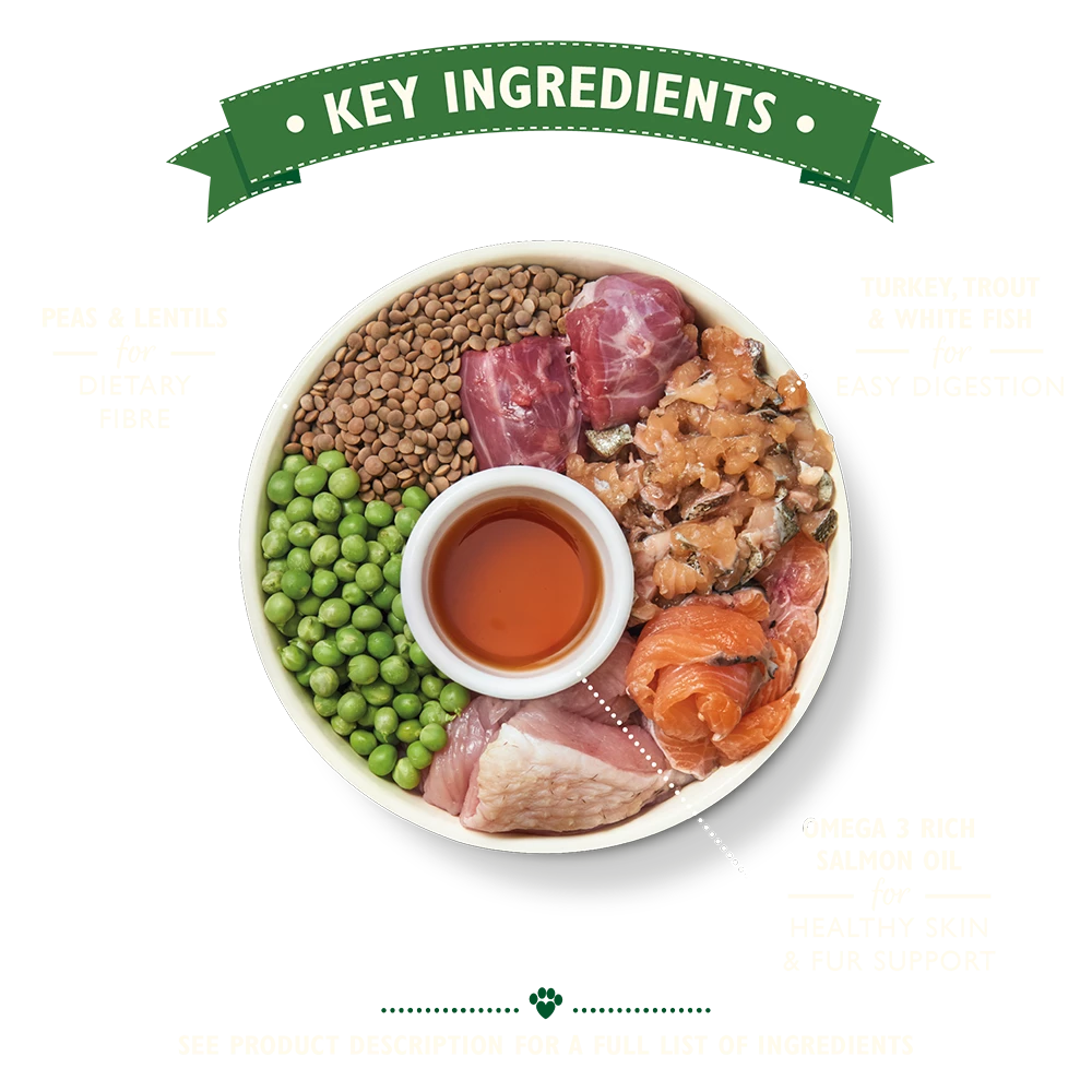 Nous avons élaboré cette savoureuse recette sans céréales avec des morceaux de viande de dinde, de truite et de poisson blanc à 43 %. Nous incorporons également des compléments pour le soin de leurs articulations et de nombreuses vitamines et ingrédients naturels pour un aliment très nutritif. Nous utilisons uniquement de la viande et du poisson fraîchement préparés, des fruits et des légumes, ainsi que des plantes herbacées de grande qualité. Cette recette est une source fantastique de vitamines et de minéraux essentiels dont votre chien a besoin dans son alimentation quotidienne.