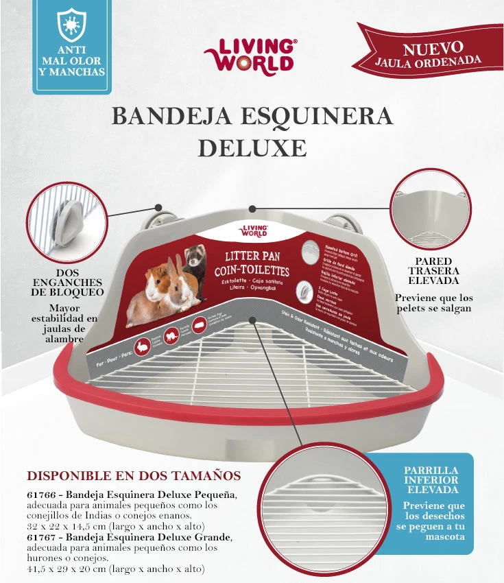 Fait de taches et un matériau résistant à l’odeur, il a une grille élevée aux pattes de l’aide Gardez vos animaux propres et les empêcher de se répandre dans toute la cage des déchets et le reste de leur région. La grille est amovible, ce qui rend facile à nettoyer. Il dispose de deux verrous qui permettent le plateau de coin pour attacher facilement à toutes les cages grillagées et restent stables. De cette façon, votre animal sera complètement sécurisé en visitant son coin favori. Le plateau d’angle Deluxe est conçu avec une paroi arrière assez élevé, l’empêchant de se répandre tout autour de la cage et le reste de la zone de votre animal de compagnie. Une idée pratique et confortable.