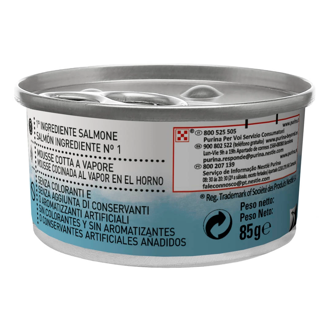 Beyond (R) Grain Free Recipe vous offre un large choix de nourritures pour chats pour vous aider à soutenir la santé de votre chat avec la même excellente nutrition que vous êtes en droit d’attendre de nous. En allant au-delà des céréales, nous élargissons notre offre d’aliments pour chats en vous donnant le choix d’une combinaison alternative qui convient le mieux à votre félin. Cette recette sans céréales contient des ingrédients reconnaissables auxquels vous faites confiance et fournit à votre chat des protéines de haute qualité. Aliment humide complet pour chats adultes avec des ingrédients naturels sélectionnés et sans céréales Sans céréales avec des ingrédients naturels sélectionnés Le saumon est le premier ingrédient Sans colorants, arômes ou conservateurs artificiels ajoutés Sans gluten ajouté Saumon (16%), Porc ?, Poulet ?, Dinde ?, Protéines de porc déshydratées, Minéraux, Epinards (0,45% d’épinards déshydratés, équivalent à 4% d’épinards), Ingrédients naturels. Additifs nutritionnels : UI/kg : Vit A : 920 ; Vit D3 : 128 ; mg/kg : Sulfate ferreux monohydraté : 34 ; iodate de calcium anhydre : 0,50 ; sulfate de cuivre pentahydraté : 3,3 ; sulfate manganeux monohydraté : 4. Constituants analytiques : Humidité : 80%, Protéines brutes : 9,6%, Huiles et graisses brutes : 6,8%, Cendres brutes : 2,4%, Fibres brutes : 0,07%. Mode d’emploi et ration journalière recommandée : Pour un chat adulte moyen (4 kg), servir 3 boîtes par jour en au moins 2 repas séparés. Les rations d’entretien moyennes pour adultes sont basées sur des chats modérément actifs dans des conditions environnementales normales. Les besoins individuels varient et la quantité de nourriture doit être adaptée en conséquence pour que votre chat conserve un poids maigre et sain. Fournissez toujours de l’eau propre et fraîche.