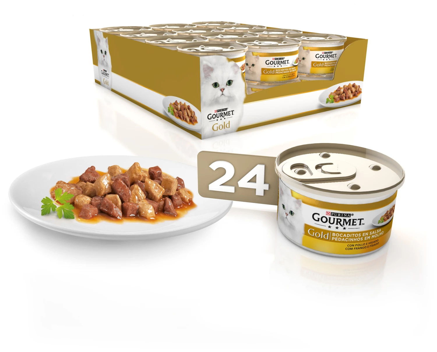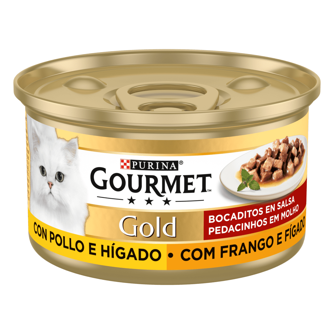 Votre chat est un véritable expert, donc il aime déguster des textures et des saveurs différentes chaque jour. Pour cette raison, GOURMET Gold a créé Bocaditos en Salsa, ou Bouchées en Sauce. Voici de recettes savoureuses conçues pour ravir le palais délicat du chat à travers une expérience de goût différente à chaque repas. Ce sont de petits morceaux tendres de viandes ou de poissons doucement cuits dans une savoureuse sauce afin d’offrir à votre chat le plaisir d’un goût fabuleux et délicieux.