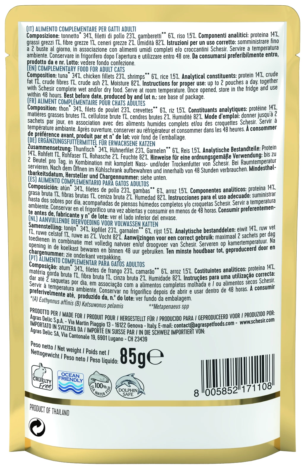 100 grammes de qualité pour votre chat. Thon et poulet avec crevettes. La meilleure qualité dans plusieurs goûts en gelée, pour satisfaire le palais de votre chat: 100% d’ingrédients naturels, sans conservateurs ni colorants; seules les meilleures parties du poisson et de la viande, cuits à la vapeur et traitées à la main, en sachet de 100g. INGRÉDIENTS: Composition: thon 34%, filets de poulet 23%, crevettes 6%, riz 1,5%.Additifs nutritionnels/kg: Vit. A 1325 U.I., Vit. E 15 mg., Taurine 160 mg. Constituants analytiques: protéine 13%, matières graisses brutes 1,5%, cellulose brute 0,1%, cendres brutes 1%, humidité 84%, 79,7 kcal/100 g.