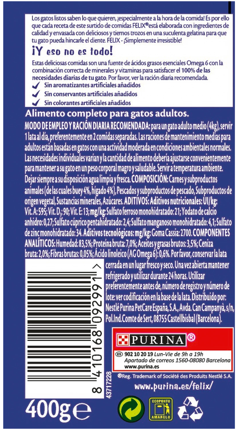 FELIX est fait d’ingrédients de qualité et emballé avec des morceaux juteux dans une gelée succulente afin que votre chat puisse profiter d’un repas irrésistible pour tous les jours.