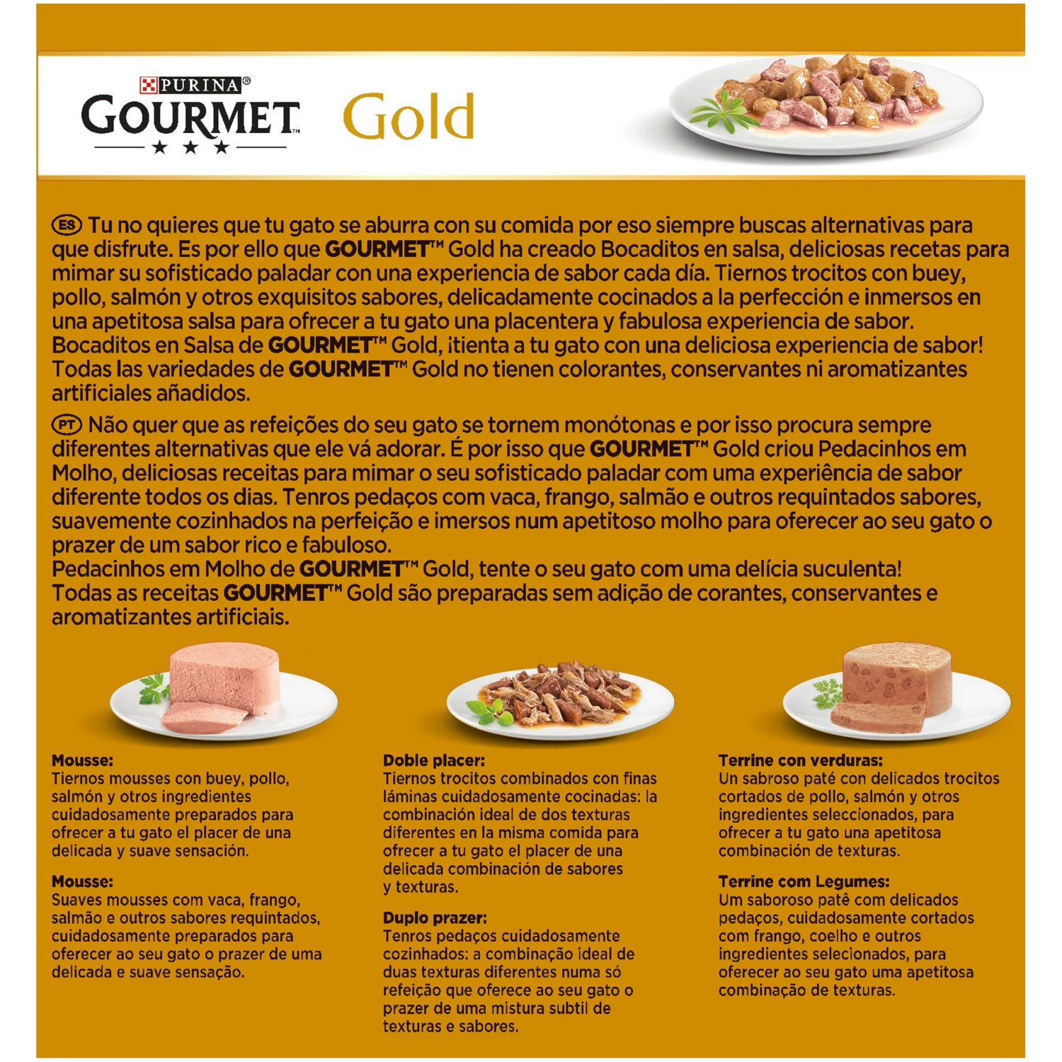 Votre chat est un véritable expert, donc il aime déguster des textures et des saveurs différentes chaque jour. Pour cette raison, GOURMET Gold a créé Bocaditos en Salsa, ou bouchées en Sauce. Voici de recettes savoureuses conçues pour ravir le palais délicat du chat à travers une expérience de goût différente à chaque repas. Ce sont de petits morceaux tendres de viandes ou de poissons doucement cuits dans une savoureuse sauce afin d’offrir à votre chat le plaisir d’un goût fabuleux et délicieux.