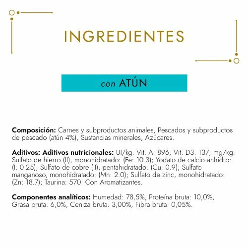 Composition : Viandes et sous-produits animaux, Poissons et sous-produits de poisson (dont thon 4 %), Substances minérales, Sucres.