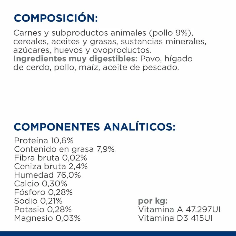 Bienfaits Essentiels – Une teneur élevée en protéines spécifiques pour favoriser la cicatrisation et préserver le système immunitaire. – Des ingrédients facilement digestibles et des calories supplémentaires pour les animaux en phase de convalescence suite à une chirurgie ou une maladie grave. – Un goût excellent et une consistance molle pour rendre ce produit plus facilement administrable, notamment si il est nécessaire d’aider votre animal à manger (à la main ou utilisant une seringue).