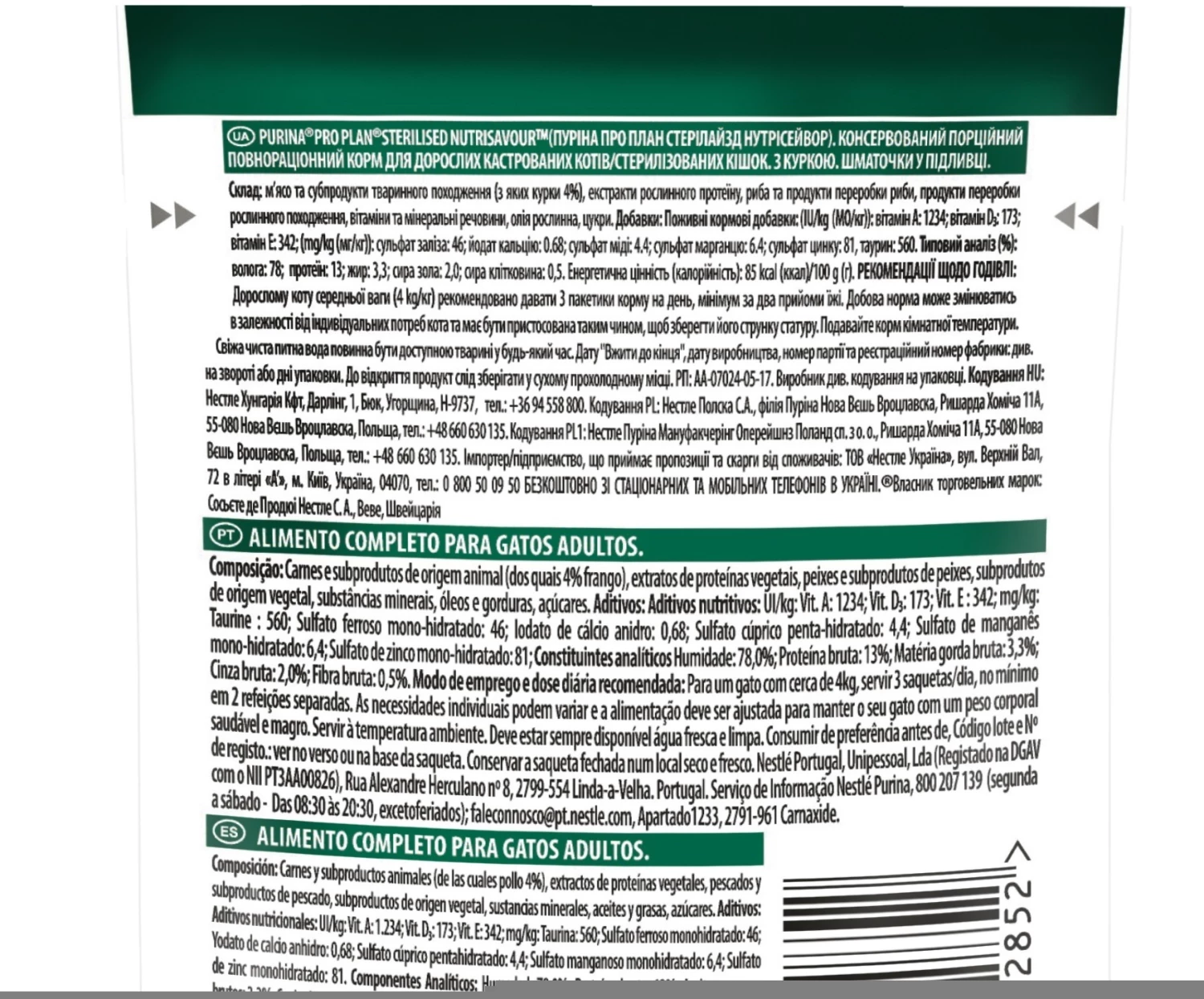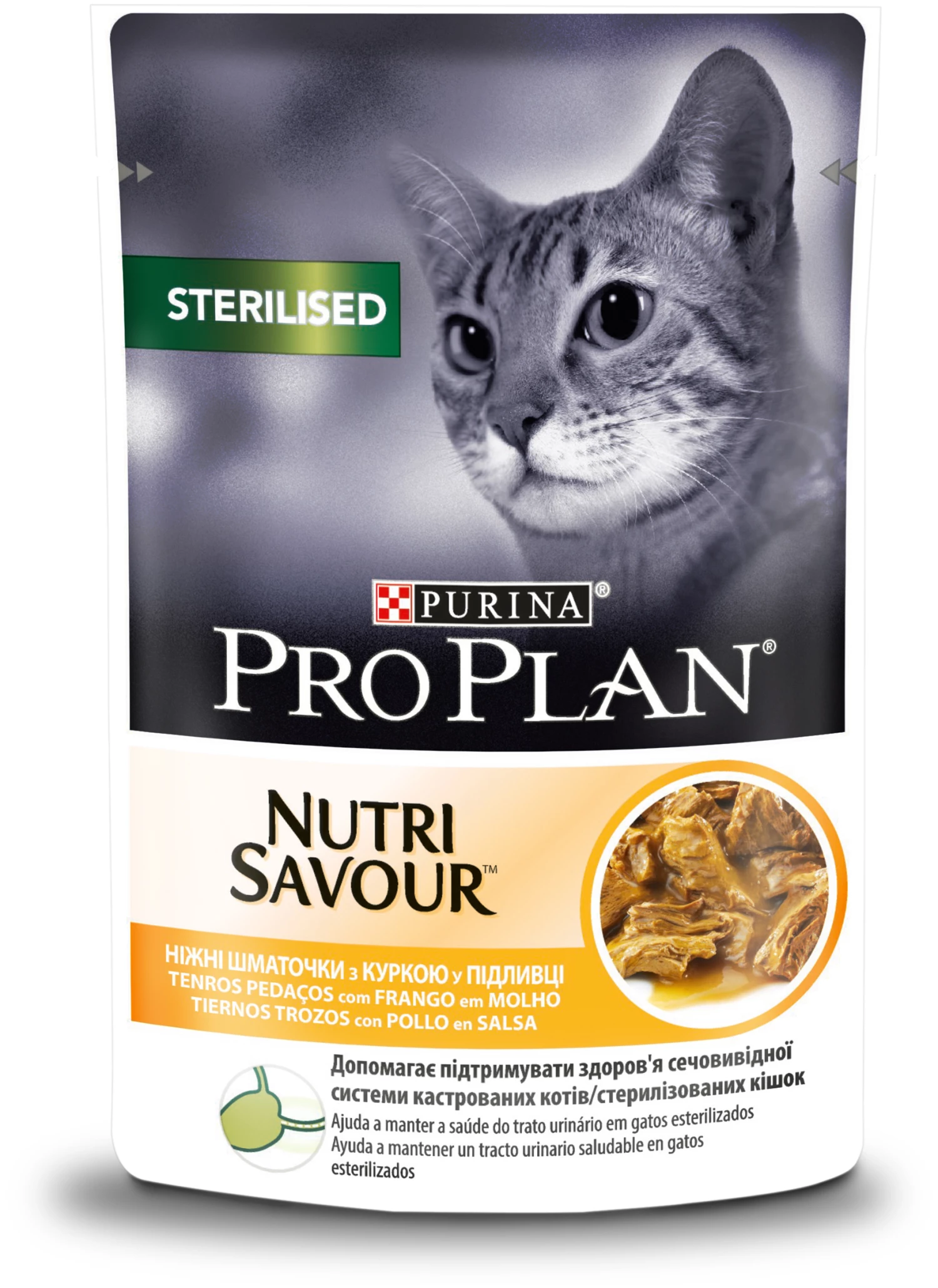 PURINA® PRO PLAN® Tendre morceaux stérilisés avec poulet en sauce est un aliment complet pour chats stérilisés