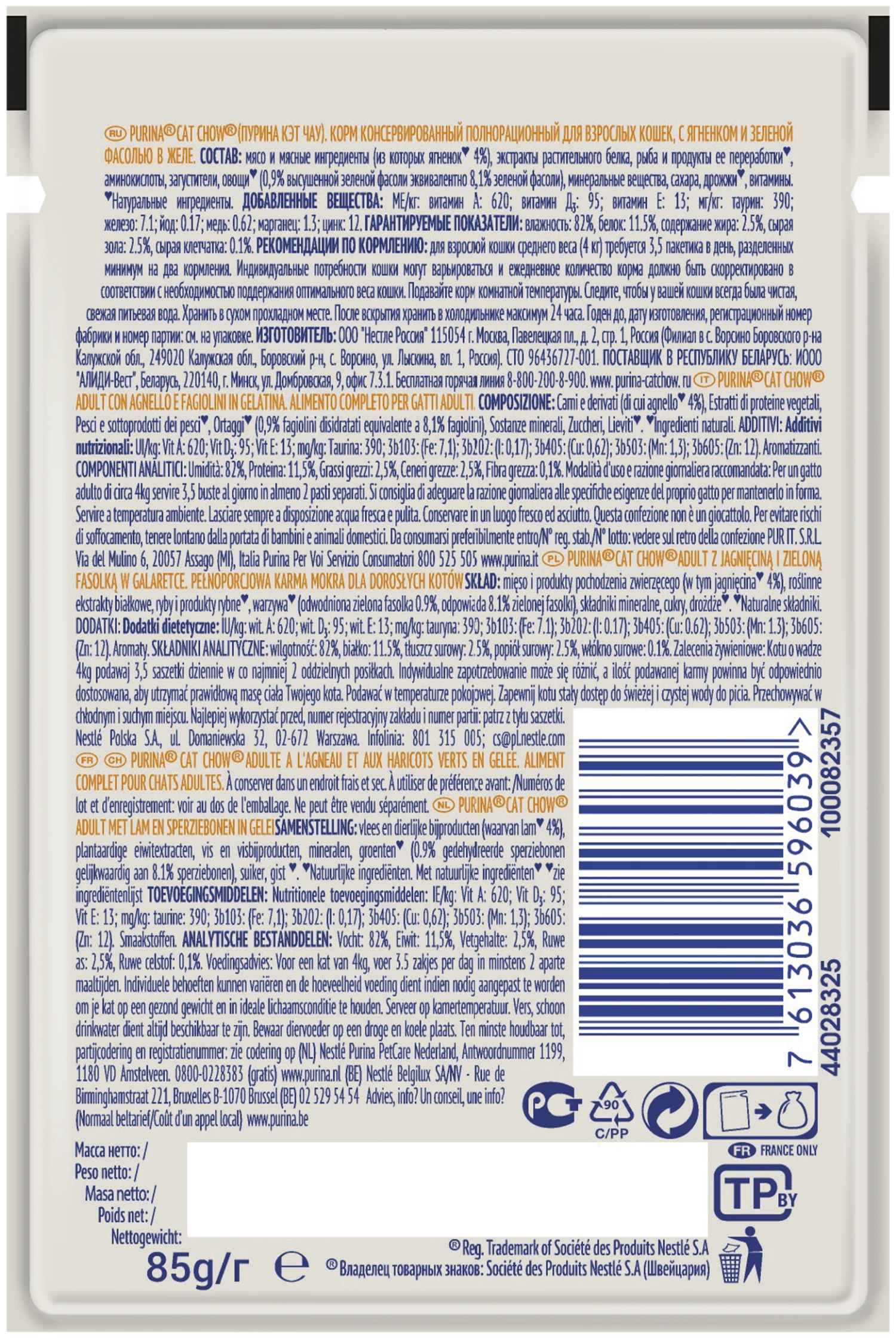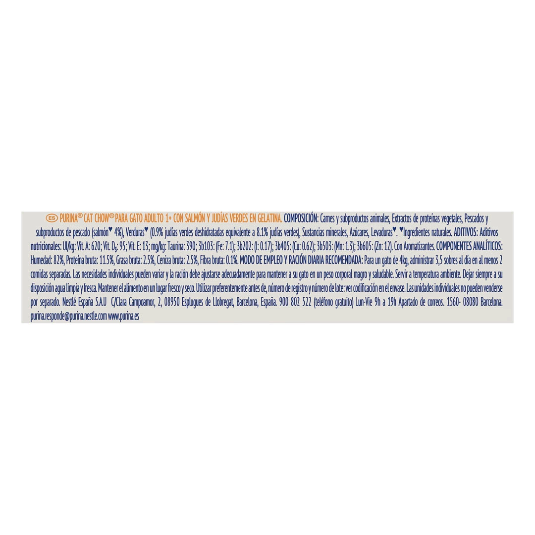 Purina Cat Chow® pour les chats adultes +1, de tendres morceaux en gelée au saumon et haricots verts aliment complet pour les chats adultes. Votre chat est incroyable. Pour vous aider à rester en bonne santé, PURINA® CAT Chow® est formulé avec des protéines de qualité et d’ingrédients naturels. Sur la base de notre expérience dans la nutrition féline depuis 1926, Purina Chow® CAT est une alimentation complète et équilibrée, avec tout ce que votre chat a besoin d’avoir une vie étonnante et en bonne santé. Avec des ingrédients naturels sélectionnés Croquettes pour les chats adultes. Pas de colorants, parfums ou conservateurs artificiels avec saumon tendres morceaux de haricots verts gélatine Composition: viande et animaux, extraits de protéines végétales, des poissons et subrpoductos poissons (dont le saumon * 4%), substances minérales, légumes * (0,8% séché haricots verts équivalent à 7% haricots verts), les sucres, les levures *. * Ingrédients naturels. Additifs: Additifs nutritionnels: UI / kg Vitamine A: 580; D3 Vit: 89; Vit E: 13; mg / kg: Taurine: 360; monohydrate de sulfate ferreux: 20; iodate de calcium anhydre: 0,26; sulfate cuivrique pentahydraté: 2,3; monohydrate de sulfate manganeux: 4,0; Le monohydrate de zinc: 33. Additifs: Additifs technologiques: mg / kg: cassia gomme: 2900. Constituants analytiques: Humidité: 82% de protéines brutes 11,5%, des graisses et huiles brutes: 2,5% Cendres brutes: brutes fibres 2,5%: 0,1% . MODE ET indemnité journalière recommandée: pour un chat adulte moyen (4kg) servent de 3 à 4 jours dans des enveloppes aux moins 2 repas séparés. Entretien demi rations pour les adultes sont basés chez les chats ayant une activité modérée dans des conditions environnementales normales. Les besoins individuels varient et la quantité de nourriture doivent être ajustées en conséquence pour garder votre chat dans un poids corporel maigre et en bonne santé. Servir à la température ambiante. Laissez toujours à votre disposition l’eau propre et fraîche. Si vous décidez souhaitez le nourrir avec des croquettes de chat Chow® et ces enveloppes, s’il vous plaît noter qu’une enveloppe est à peu près équivalent à 20g de Croquettes et que cette quantité de nourriture doit être ajustée en fonction de ce qui est offert.