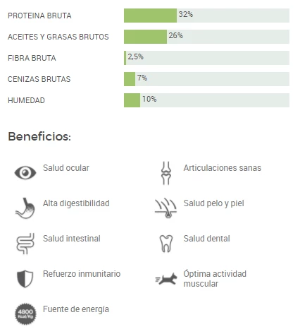 Nourriture pour chiens adultes avec un niveau élevé d’activité physique. Sa composition agit comme une source d’énergie (4800 Kcal / Kg), offrant une activité musculaire optimale. Également prescrite pour les femelles en gestation ou lactation.