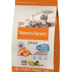 Aliment complet et équilibré pour chats adultes stérilisés, sans céréales, dont l’ingrédient principal est la viande de saumon norvégien désossée. Complété par des fruits, des légumes, des super aliments et des sources alternatives naturelles de glucides.