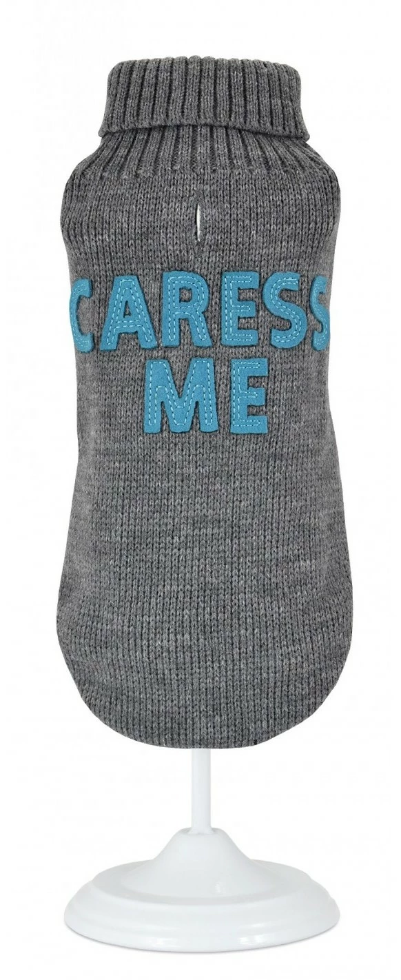 Pull avec un joli motif en polyester tricoté en couleur grise et avec des lettres bleues.